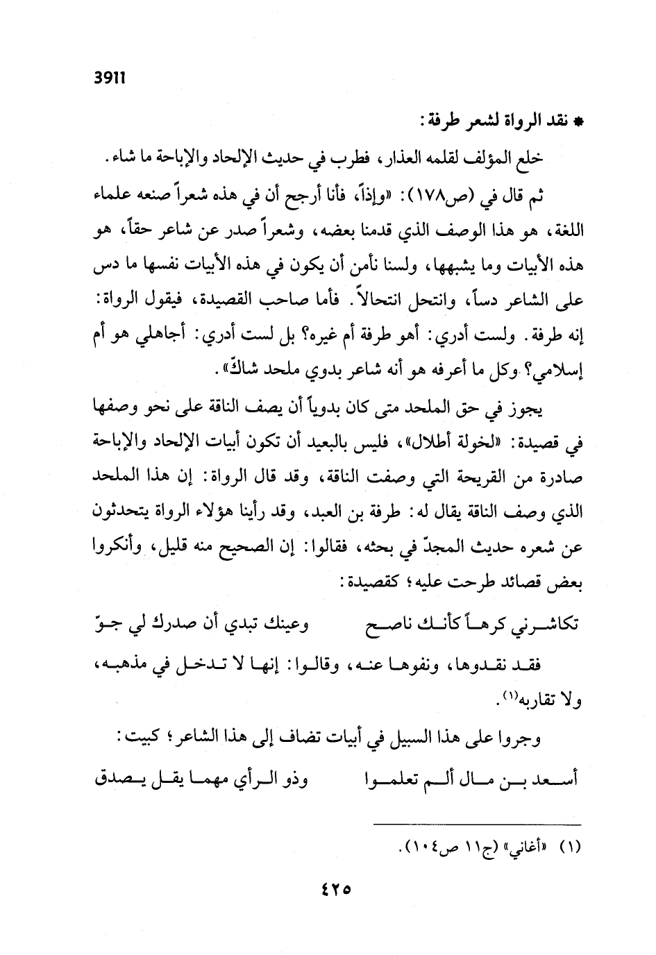 ثم قال في (ص 178): "وإذاً، فأنا أرجح أن في هذه شعراً صنعه علماء اللغة، هو هذا الوصف الذي قدمنا بعضه، وشعراً صدر عن شاعر حقاً، هو هذه الأبيات وما يشبهها، ولسنا نامن أن يكون في هذه الأبيات نفسها ما دس على الشاعر دساً، وانتحل انتحالاً. فأما صاحب القصيدة، فيقول الرواة: إنه طرفة. ولست أدري: أهو طرفة أم غيره؟ بل لست أدري: أجاهلي هو أم إسلامي؟ وكل ما أعرفه هو أنه شاعر بدوي ملحد شاكّ".