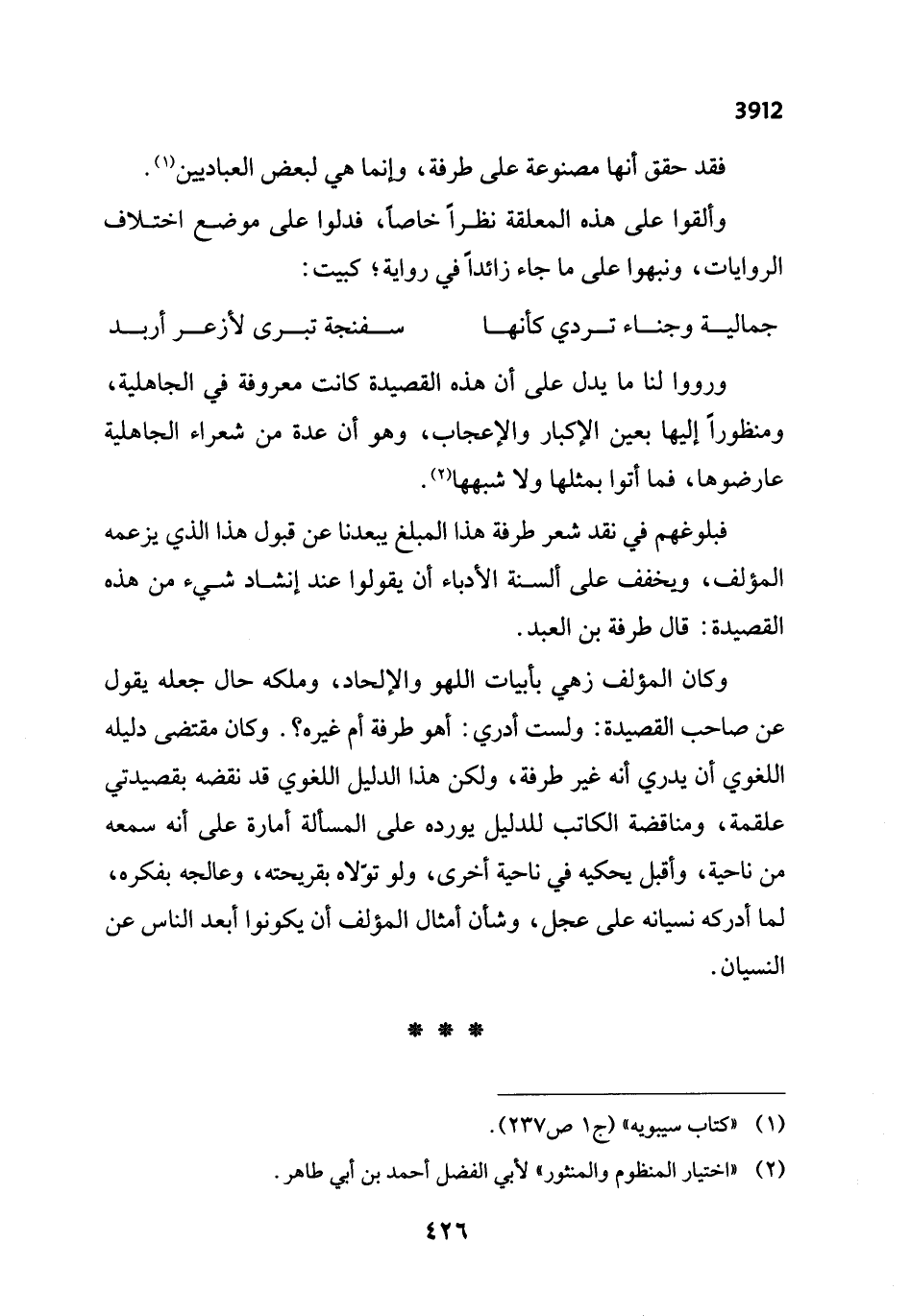 فبلوغهم في نقد شعر طرفة هذا المبلغ يبعدنا عن قبول هذا الذي يزعمه المؤلف، ويخفف على ألسنة الأدباء أن يقولوا عند إنشاد شيء من هذه القصيدة: قال طرفة بن العبد.