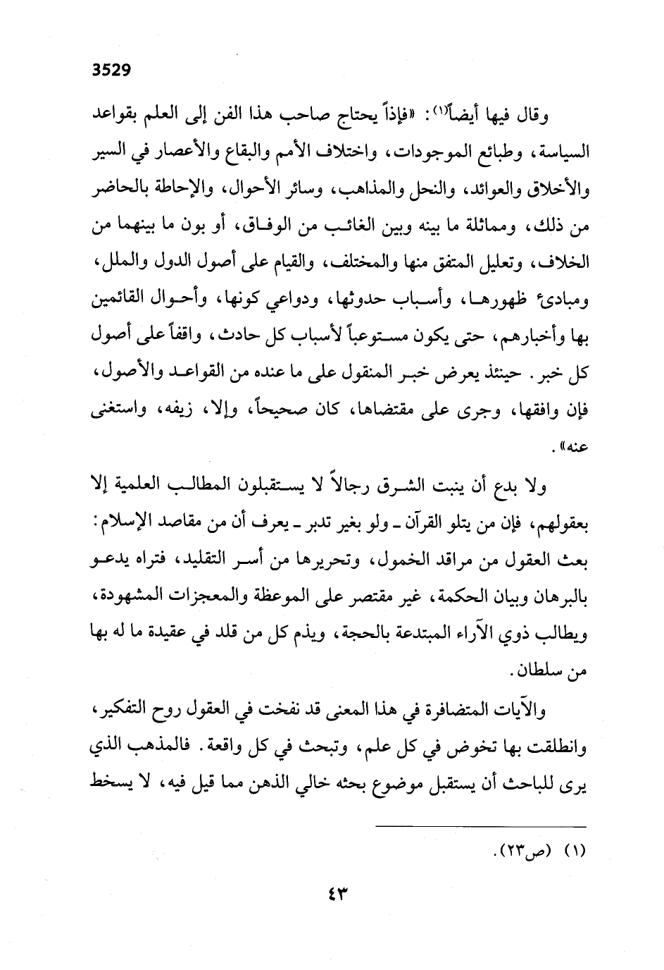 وقال فيها أيضاً (¬1): "فإذاً يحتاج صاحب هذا الفن إلى العلم بقواعد السياسة، وطبائع الموجودات، واختلاف الأمم والبقاع والأعصار في السير والأخلاق والعوائد، والنحل والمذاهب، وسائر الأحوال، والإحاطة بالحاضر من ذلك، ومماثلة ما بينه وبين الغائب من الوفاق، أو بون ما بينهما من الخلاف، وتعليل المتفق منها والمختلف، والقيام على أصول الدول والملل، ومبادئ ظهورها، وأسباب حدوثها، ودواعي كونها، وأحوال القائمين بها وأخبارهم، حتى يكون مستوعباً لأسباب كل حادث، واقفاً على أصول كل خبر. حينئذ يعرض خبر المنقول على ما عنده من القواعد والأصول، فإن وافقها، وجرى على مقتضاها، كان صحيحاً، وإلا، زيفه، واستغنى عنه".