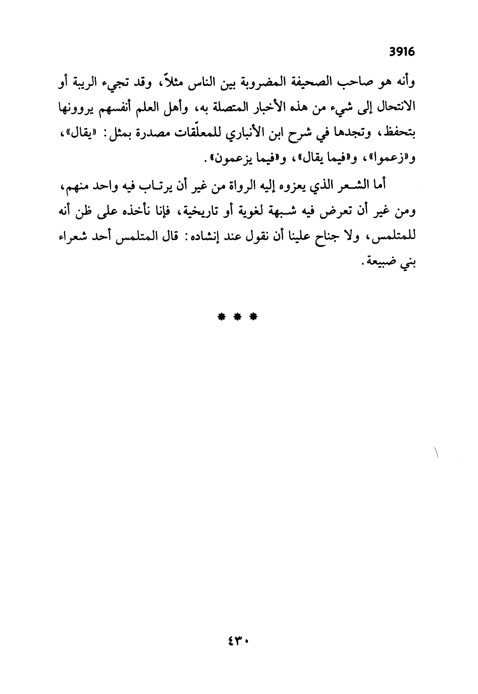 وأنه هو صاحب الصحيفة المضروبة بين الناس مثلاً، وقد تجيء الريبة أو الانتحال إلى شيء من هذه الأخبار المتصلة به، وأهل العلم أنفسهم يروونها بتحفظ، وتجدها في شرح ابن الأنباري للمعلّقات مصدرة بمثل: "يقال"، و"زعموا"، و "فيما يقال"، و "فيما يزعمون".