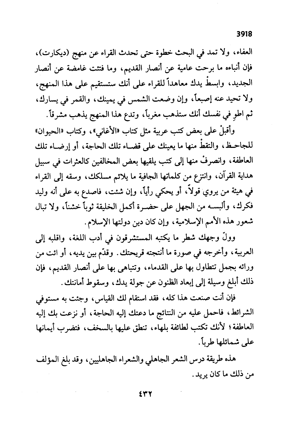 وولّ وجهك شطر ما يكتبه المستشرقون في أدب اللغة، واقلبه إلى العربية، وأخرجه في صورة ما أنتجته قريحتك. وقدم بين يديه، أو ائت من ورائه بجمل تتطاول بها على القدماء، وتتباهى بها على أنصار القديم، فإن ذلك أبلغ وسيلة إلى إبعاد الظنون عن جولة يدك، وسقوط أمانتك.