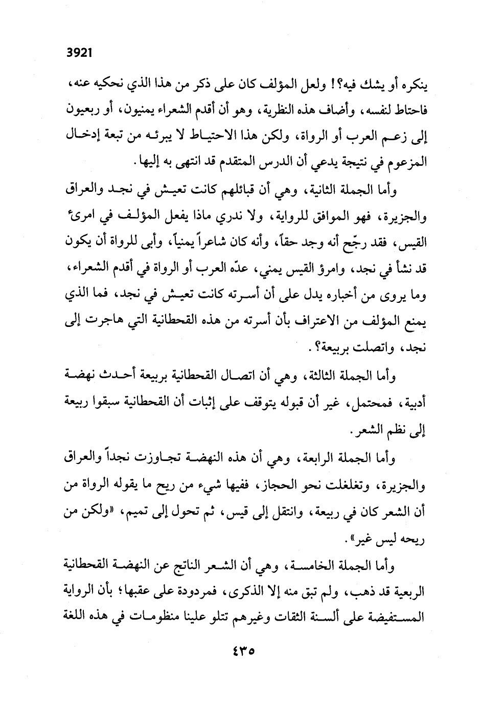 وأما الجملة الثانية، وهي أن قبائلهم كانت تعيش في نجد والعراق والجزيرة، فهو الموافق للرواية، ولا ندري ماذا يفعل المؤلف في امرئ القيس، فقد رجّح أنه وجد حقاً، وأنه كان شاعراً يمنياً، وأبى للرواة أن يكون قد نشأ في نجد، وامرؤ القيس يمني، عدّه العرب أو الرواة في أقدم الشعراء، وما يروى من أخباره يدل على أن أسرته كانت تعيش في نجد، فما الذي يمنع المؤلف من الاعتراف بأن أسرته من هذه القحطانية التي هاجرت إلى نجد، واتصلت بربيعة؟.