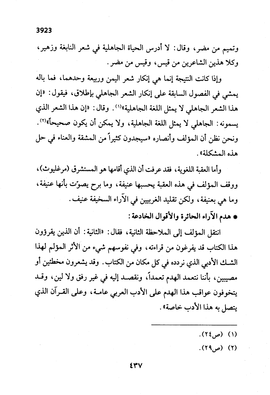 وإذا كانت النتيجة إنما هي إنكار شعر اليمن وربيعة وحدهما، فما باله يمشي في الفصول السابقة على إنكار الشعر الجاهلي بإطلاق، فيقول: "إن هذا الشعر الجاهلي لا يمثل اللغة الجاهلية" (¬1). وقال: "إن هذا الشعر الذي يسمونه: الجاهلي لا يمثل اللغة الجاهلية، ولا يمكن أن يكون صحيحاً" (¬2). ونحن نظن أن المؤلف وأنصاره "سيجدون كثيراً من المشقة والعناء في حل
