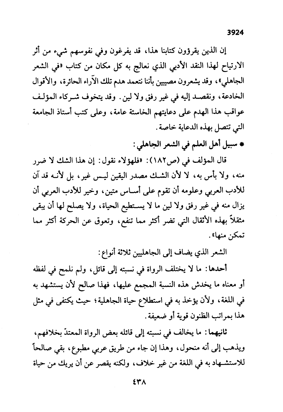 إن الذين يقرؤون كتابنا هذا، قد يفرغون وفي نفوسهم شيء من أثر الارتياح لهذا النقد الأدبي الذي نعالج به كل مكان من كتاب "في الشعر الجاهلي"، وقد يشعرون مصييين بأننا نتعمد هدم تلك الآراء الحائرة، والأقوال الخادعة، ونقصد إليه في غير رفق ولا لين. وقد يتخوف شركاء المؤلف عواقب هذا الهدم على دعايتهم الخاسئة عامة، وعلى كتب أستاذ الجامعة التي تتصل بهذه الدعاية خاصة.