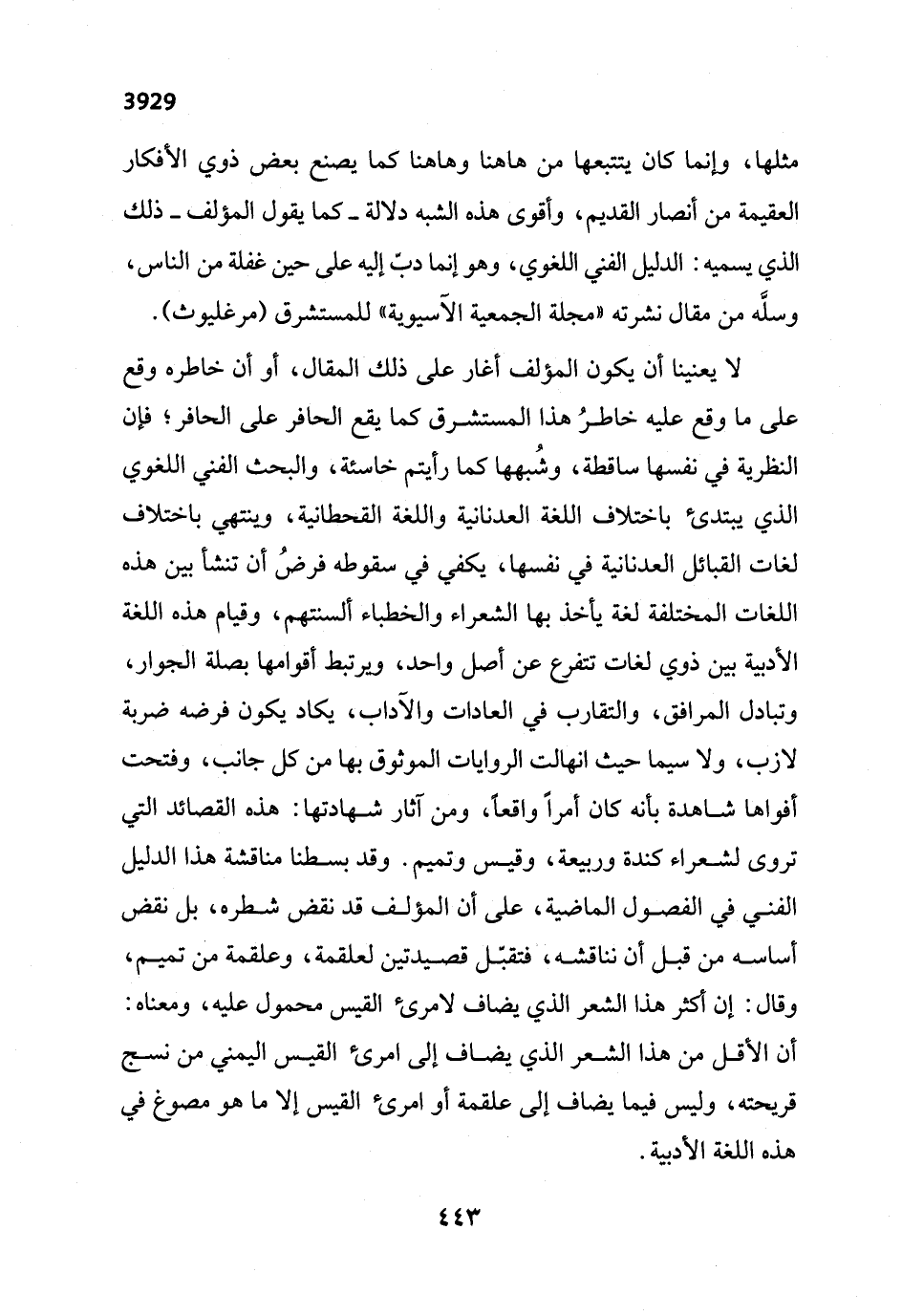 لا يعنينا أن يكون المؤلف أغار على ذلك المقال، أو أن خاطره وقع على ما وقع عليه خاطرُ هذا المستشرق كما يقع الحافر على الحافر؛ فإن النظرية في نفسها ساقطة، وشُبهها كما رأيتم خاسئة، والبحث الفني اللغوي الذي يبتدئ باختلاف اللغة العدنانية واللغة القحطانية، وينتهي باختلاف لغات القبائل العدنانية في نفسها، يكفي في سقوطه فرضُ أن تنشأ بين هذه اللغات المختلفة لغة يأخذ بها الشعراء والخطباء ألسنتهم، وقيام هذه اللغة الأدبية بين ذوي لغات تتفرع عن أصل واحد، ويرتبط أقوامها بصلة الجوار، وتبادل المرافق، والتقارب في العادات والآداب، يكاد يكون فرضه ضربة لازب، ولا سيما حيث انهالت الروايات الموثوق بها من كل جانب، وفتحت أفواها شاهدة بأنه كان أمراً واقعاً، ومن آثار شهادتها: هذه القصائد التي تروى لشعراء كندة وربيعة، وقيس وتميم. وقد بسطنا مناقشة هذا الدليل الفني في الفصول الماضية، على أن المؤلف قد نقض شطره، بل نقض أساسه من قبل أن نناقشه، فتقبّل قصيدتين لعلقمة، وعلقمة من تميم، وقال: إن أكثر هذا الشعر الذي يضاف لامرئ القيس محمول عليه، ومعناه: أن الأقل من هذا الشعر الذي يضاف إلى امرئ القيس اليمني من نسج قريحته، وليس فيما يضاف إلى علقمة أو امرئ القيس إلا ما هو مصوغ في هذه اللغة الأدبية.