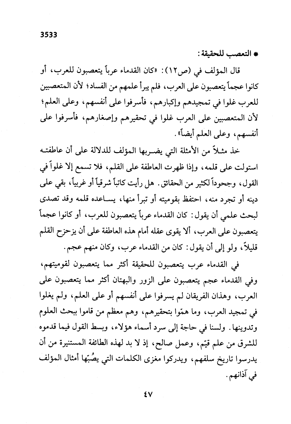 قال المؤلف في (ص 12): "كان القدماء عرباً يتعصبون للعرب، أو كانوا عجماً يتعصبون على العرب، فلم يبرأ علمهم من الفساد؛ لأن المتعصبين للعرب غلوا في تمجيدهم وإكبارهم، فأسرفوا على أنفسهم، وعلى العلم؛ لأن المتعصبين على العرب غلوا في تحقيرهم وإصغارهم، فأسرفوا على أنفسهم، وعلى العلم أيضاً".