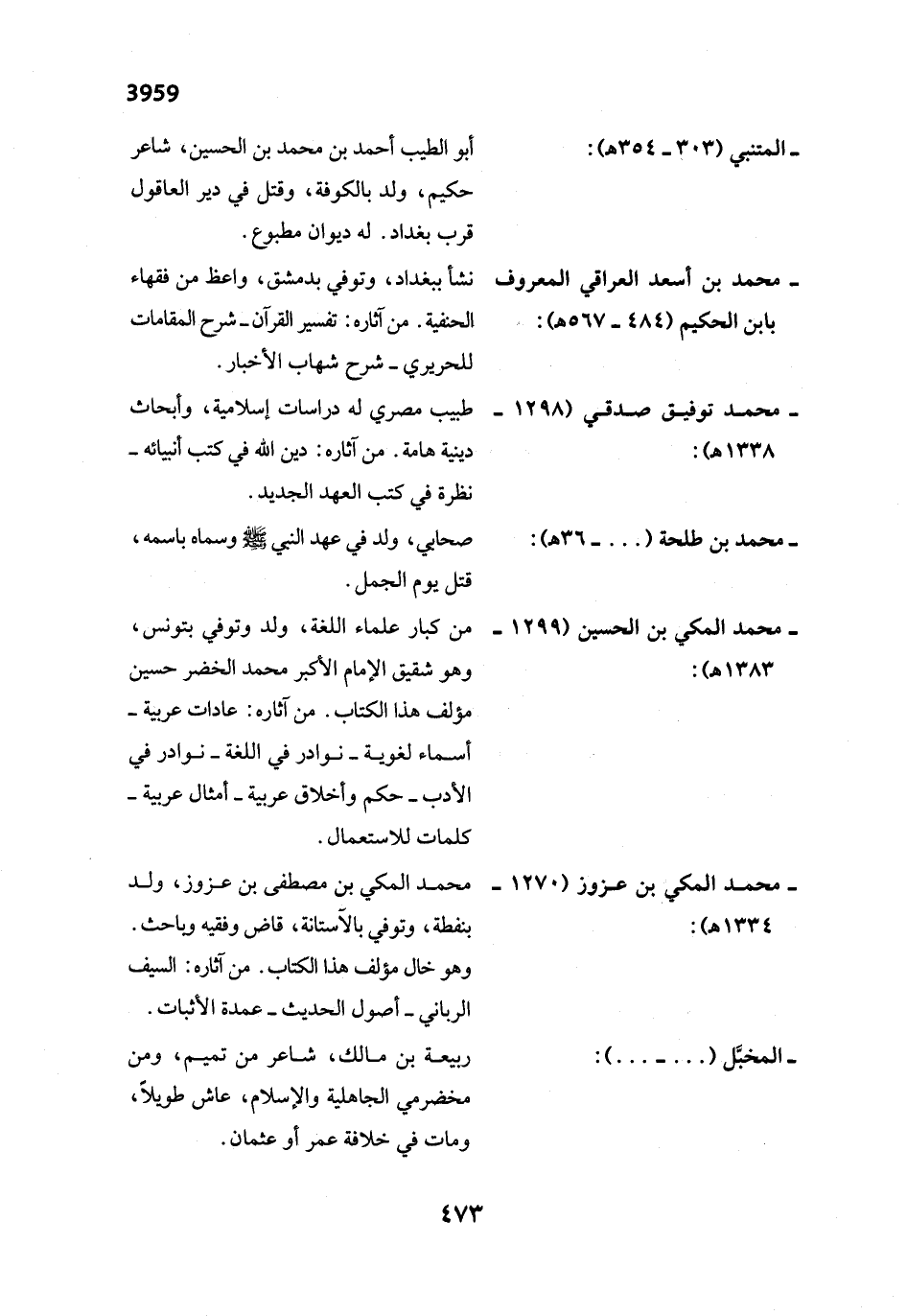 - المتنبي (303 - 354 هـ): أبو الطيب أحمد بن محمد بن الحسين، شاعر حكيم، ولد بالكوفة، وقتل في دير العاقول قرب بغداد. له ديوان مطبوع.