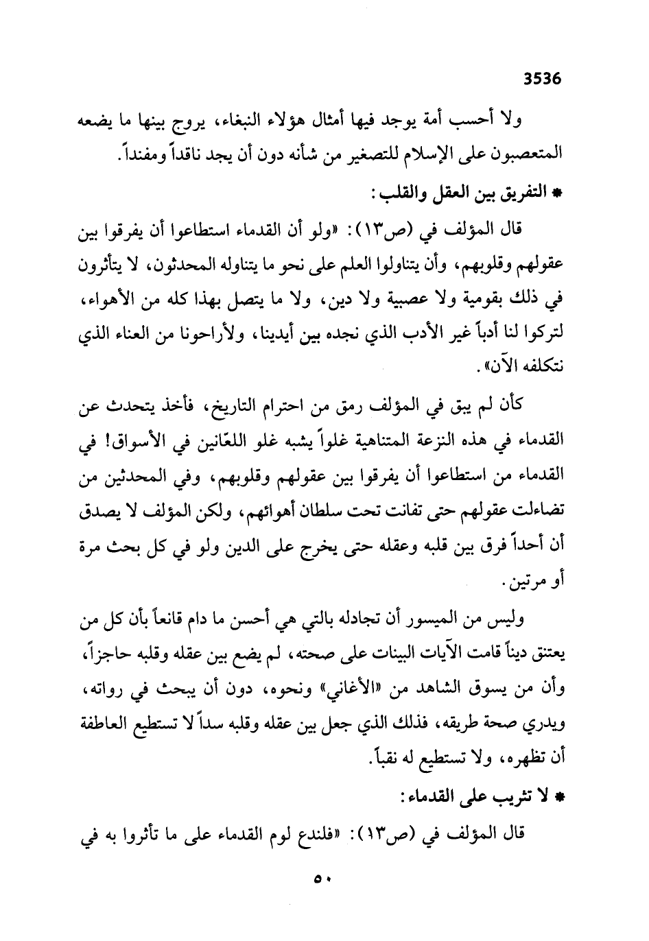 كأن لم يبق في المؤلف رمق من احترام التاريخ، فأخذ يتحدث عن القدماء في هذه النزعة المتناهية غلواً يشبه غلو اللعّانين في الأسواق! في القدماء من استطاعوا أن يفرقوا بين عقولهم وقلوبهم، وفي المحدثين من تضاءلت عقولهم حتى تفانت تحت سلطان أهوائهم، ولكن المؤلف لا يصدق أن أحداً فرق بين قلبه وعقله حتى يخرج على الدين ولو في كل بحث مرة أو مرتين.