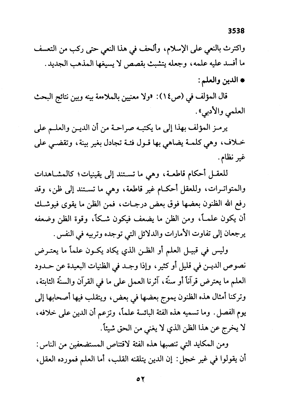 وليس في قبيل العلم أو الظن الذي يكاد يكون علماً ما يعترض نصوص الدين في قليل أو كثير، وإذا وجد في الظنيات البعيدة عن حدود العلم ما يعترض قرآناً أو سنّة، آثرنا العمل على ما في القرآن والسنّة الثابتة، وتركنا أمثال هذه الظنون يموج بعضها في بعض، ويتقلب فيها أصحابها إلى يوم الفصل. وما تسميه هذه الفئة البائسة علماً، وتزعم أن الدين على خلافه، لا يخرج عن هذا الظن الذي لا يغني من الحق شيئاً.