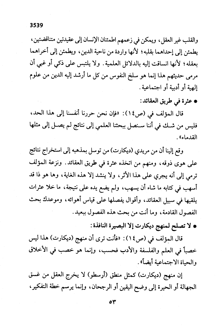 وقع إلينا أن من مريدي (ديكارت) من توسل بمذهبه إلى استخراج نتائج على هوى ذوقه، ومنهم من اتخذه عثرة في طريق العقائد. ونزعة المؤلف ترمي إلى أنه يجري على هذا الأثر، ولا ينشد إلا هذه الغاية، وها هو ذا قد أسهب في كتابه ما شاء أن يسهب، ولم يضع يده على نتيجة، ما خلا عثرات يلقيها في سبيل العقائد، وأقوال يفصلها على قياس أهوائه، وموعدك بحث الفصول القادمة، وما أنت من بحث هذه الفصول ببعيد.