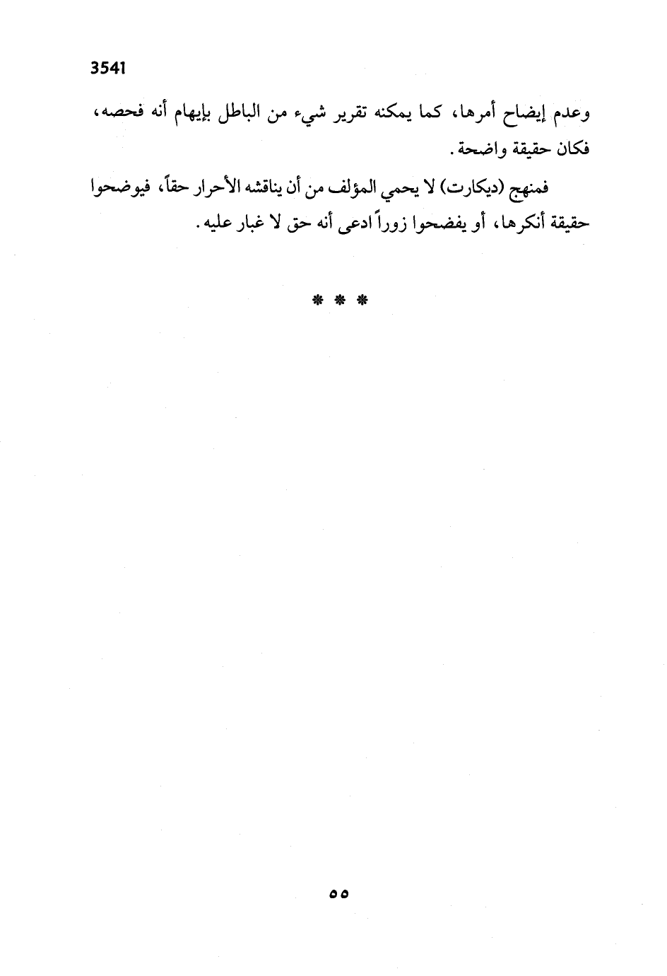 فمنهج (ديكارت) لا يحمي المؤلف من أن يناقشه الأحرار حقاً، فيوضحوا حقيقة أنكرها، أو يفضحوا زوراً ادعى أنه حق لا غبار عليه.