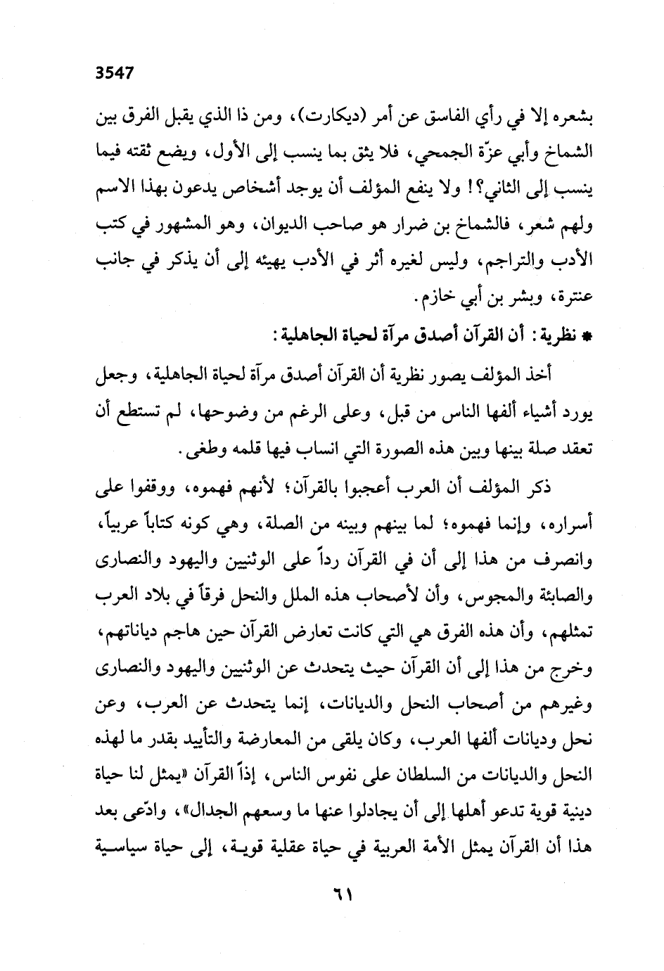 أخذ المؤلف يصور نظرية أن القرآن أصدق مرآة لحياة الجاهلية، وجعل يورد أشياء ألفها الناس من قبل، وعلى الرغم من وضوحها، لم تستطع أن تعقد صلة بينها وبين هذه الصورة التي انساب فيها قلمه وطغى.