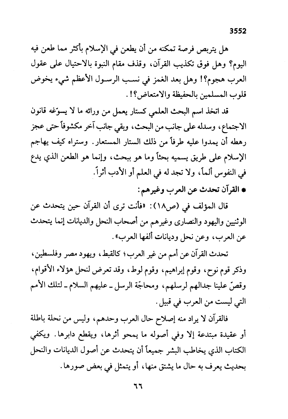 قد اتخذ اسم البحث العلمي كستار يعمل من ورائه ما لا يسوّغه قانون الاجتماع، وسدله على جانب من البحث، ويقي جانب آخر مكشوفًا حتى عجز رهطه أن يمدوا عليه طرفاً من ذلك الستار المستعار. وستراه كيف يهاجم الإسلام على طريق يسميه بحثاً وما هو ببحث، وإنما هو الطعن الذي يدع في النفوس ألمًا، ولا تجد له في العلم أو الأدب أثراً.