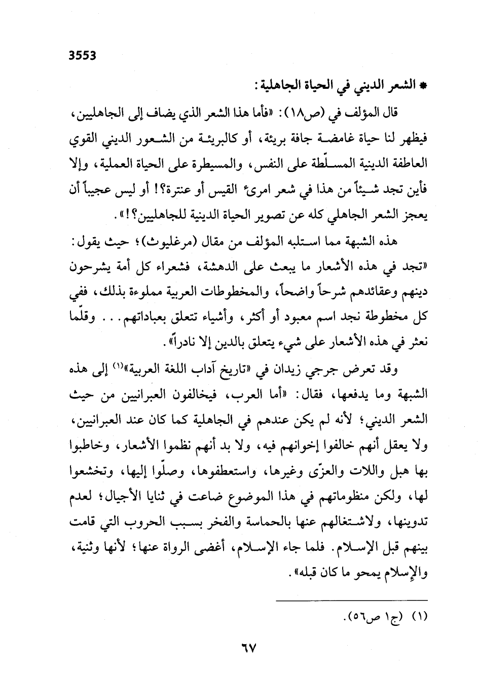 قال المؤلف في (ص 18): "فأما هذا الشعر الذي يضاف إلى الجاهليين، فيظهر لنا حياة غامضة جافة بريئة، أو كالبريئة من الشعور الديني القوي العاطفة الدينية المسلّطة على النفس، والمسيطرة على الحياة العملية، وإلا فأين تجد شيئاً من هذا في شعر امرئ القيس أو عنترة؟! أو ليس عجيباً أن يعجز الشعر الجاهلي كله عن تصوير الحياة الدينية للجاهليين؟! ".