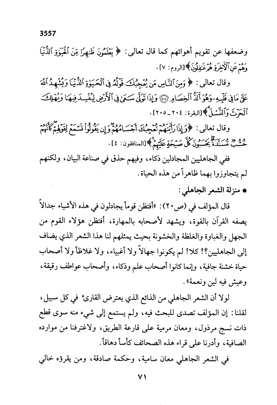 قال المؤلف في (ص 25): "أفتظن قوماً يجادلون في هذه الأشياء جدالاً يصفه القرآن بالقوة، ويشهد لأصحابه بالمهارة، أفتظن هؤلاء القوم من الجهل والغباوة والغلظة والخشونة بحيث يمثلهم لنا هذا الشعر الذي يضاف إلى الجاهليين؟! كلا! لم يكونوا جهالاً ولا أغبياء، ولا غلاظاً ولا أصحاب حياة خشنة جافية، وإنما كانوا أصحاب علم وذكاء، وأصحاب عواطف رقيقة، وعيش فيه لين ونعمة".