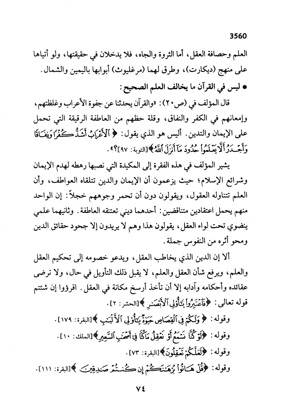 يشير المؤلف في هذه الفقرة إلى المكيدة التي نصبها رهطه لهدم الإيمان وشرائع الإسلام؛ حيث يزعمون أن الإيمان والدين تتلقاه العواطف، وأن العلم تتناوله العقول، ويقولون دون أن تحمر وجوههم خجلًا: إن الواحد منهم يحمل اعتقادين متناقضين: أحدهما ديني تعتنقه العاطفة. وثانيهما علمي ينضوي تحت لواء العقل، يقولون هذا وهم لا يريدون إلا جحود حقائق الدين ومحو أثره من النفوس جملة.