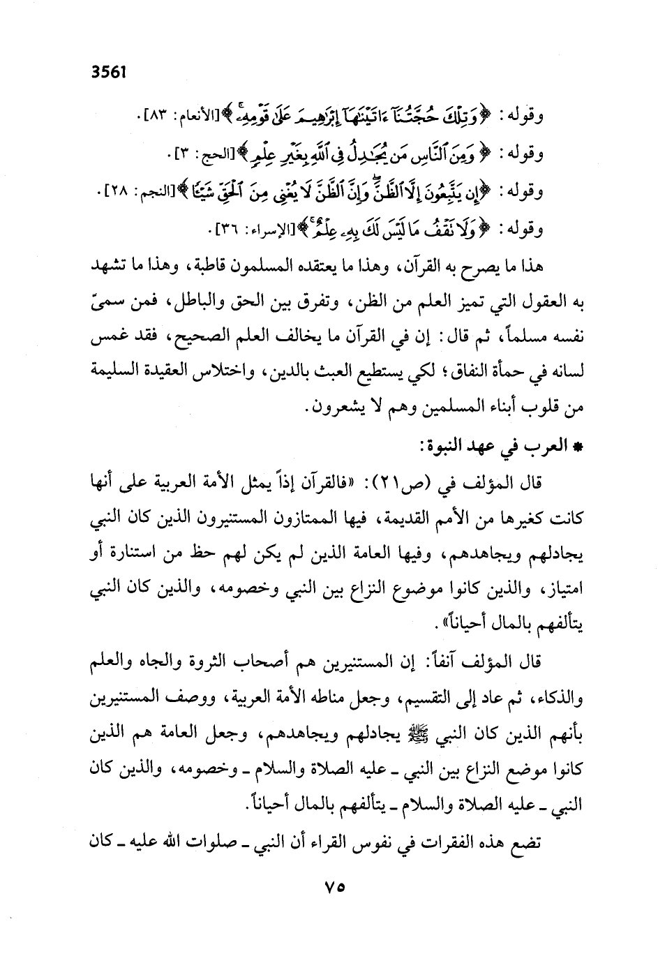 قال المؤلف في (ص 21): "فالقرآن إذاً يمثل الأمة العربية على أنها كانت كغيرها من الأمم القديمة، فيها الممتازون المستنيرون الذين كان النبي يجادلهم ويجاهدهم، وفيها العامة الذين لم يكن لهم حظ من استنارة أو امتياز، والذين كانوا موضوع النزل بين النبي وخصومه، والذين كان النبي يتألفهم بالمال أحياناً".