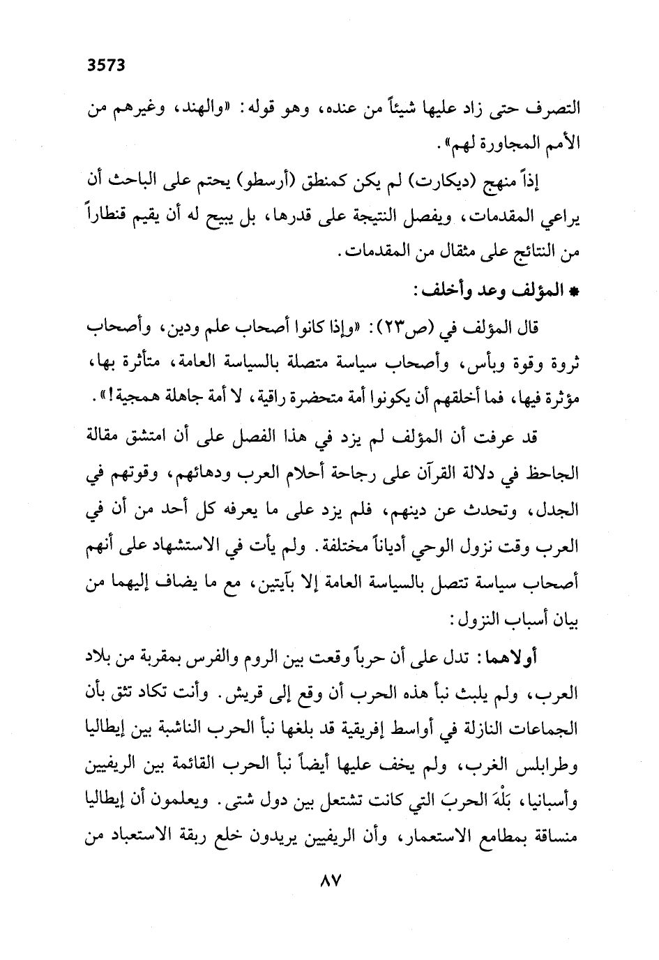 قد عرفت أن المؤلف لم يزد في هذا الفصل على أن امتشق مقالة الجاحظ في دلالة القرآن على رجاحة أحلام العرب ودهائهم، وقوتهم في الجدل، وتحدث عن دينهم، فلم يزد على ما يعرفه كل أحد من أن في العرب وقت نزول الوحي أدياناً مختلفة. ولم يأت في الاستشهاد على أنهم أصحاب سياسة تتصل بالسياسة العامة إلا بآيتين، مع ما يضاف إليهما من بيان أسباب النزول: