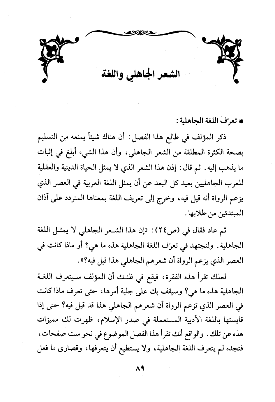 لعلك تقرأ هذه الفقرة، فيقع في ظنك أن المؤلف سيتعرف اللغة الجاهلية هذه ما هي؟ وسيقف بك على جلية أمرها، حتى تعرف ماذا كانت في العصر الذي تزعم الرواة أن شعرهم الجاهلي هذا قد قيل فيه؟ حتى إذا قايستها باللغة الأدبية المستعملة في صدر الإسلام، ظهرت لك مميزات هذه عن تلك. والواقع أنك تقرأ هذا الفصل الموضوع في نحو ست صفحات، فتجده لم يتعرف اللغة الجاهلية، ولا يستطيع أن يتعرفها، وقصارى ما فعل