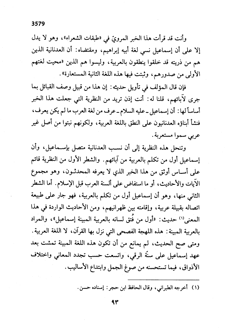 فإن قال المؤلف في تأويل حديثه: إن هذا من قبيل وصف القبائل بما جرى لآبائهم، قلنا له: أنت إذن تريد من النظرية التي جعلت هذا الخبر أساسًا لها: أن إسماعيل - عليه السلام - عرف من لغة العرب ما لم يكن يعرف، فنشأ أبناؤه العدنانيون على النطق باللغة العربية، ولكونهم نبتوا من أصل غير عربي سموا مستعربة.