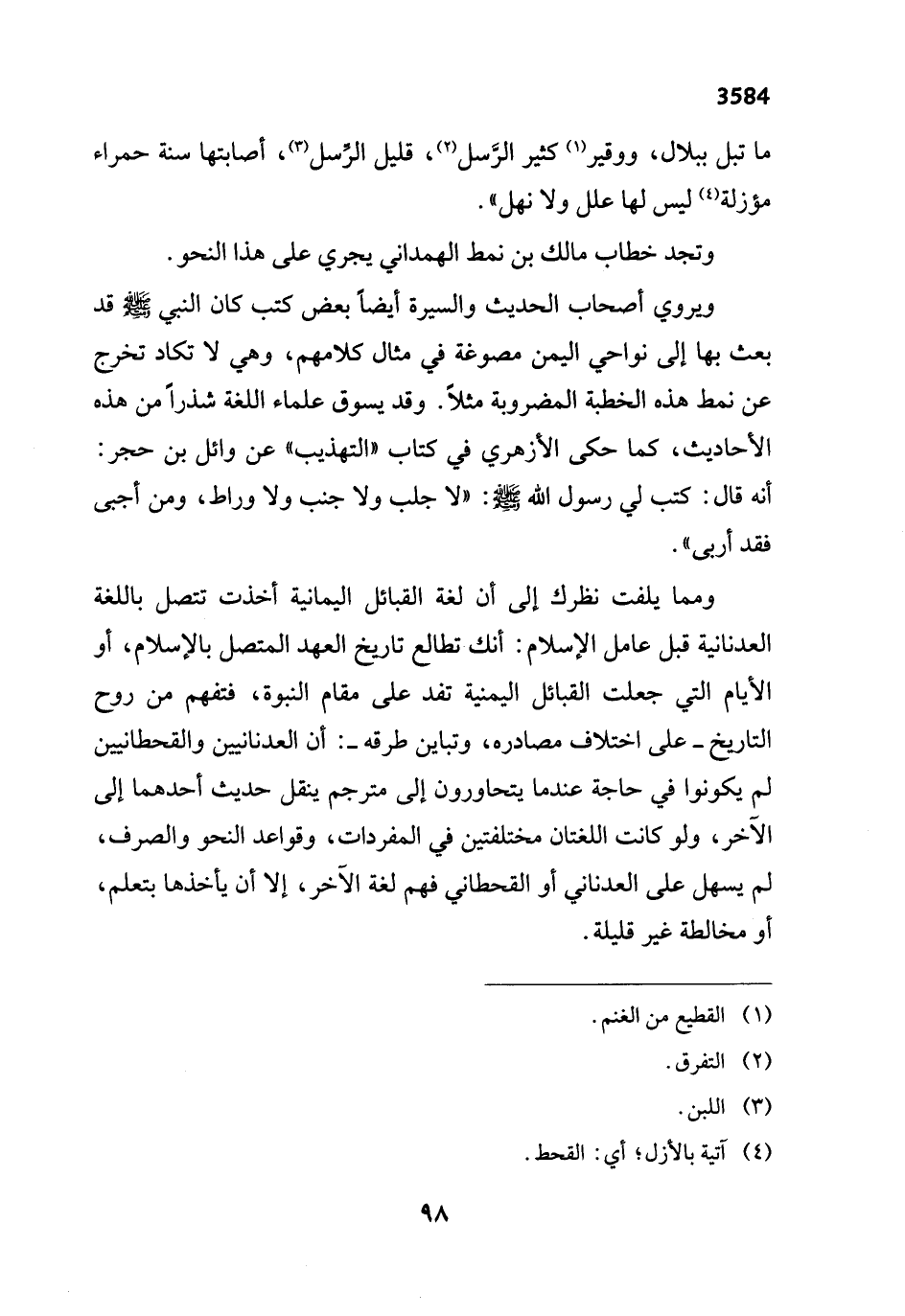 ومما يلفت نظرك إلى أن لغة القبائل اليمانية أخذت تتصل باللغة العدنانية قبل عامل الإسلام: أنك تطالع تاريخ العهد المتصل بالإسلام، أو الأيام التي جعلت القبائل اليمنية تفد على مقام النبوة، فتفهم من روح التاريخ -على اختلاف مصادره، وتباين طرقه-: أن العدنانيين والقحطانيين لم يكونوا في حاجة عندما يتحاورون إلى مترجم ينقل حديث أحدهما إلى الآخر، ولو كانت اللغتان مختلفتين في المفردات، وقواعد النحو والصرف، لم يسهل على العدناني أو القحطاني فهم لغة الآخر، إلا أن يأخذها بتعلم، أو مخالطة غير قليلة.