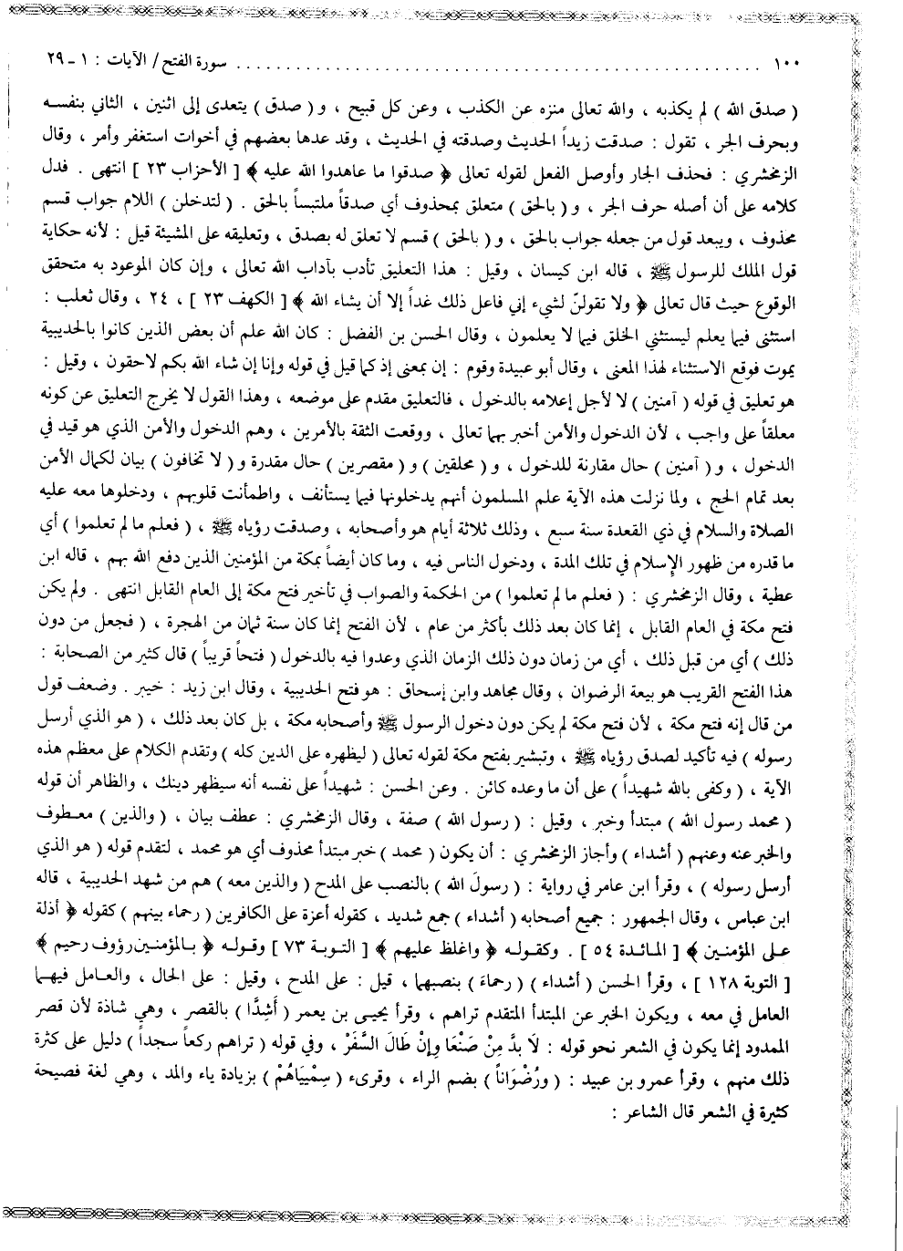 ) صَدَقَ اللَّهُ ( : لم يكذبه ، والله تعالى منزه عن الكذب وعن كل قبيح . وصدق يتعدى إلى اثنين ، الثاني بنفسه وبحرف الجر . تقول : صدقت زيداً الحديث ، وصدقته في الحديث ؛ وقد عدها بعضهم في أخوات استغفر وأمر . وقال الزمخشري : فحذف الجار وأوصل الفعل لقوله تعالى : ) صَدَقُواْ مَا عَاهَدُواْ اللَّهَ عَلَيْهِ ). انتهى . فدل كلامه على أن أصله حرف الجر . وبالحق متعلق بمحذوف ، أي صدقاً ملتبساً بالحق . ) لَتَدْخُلُنَّ ( : اللام جواب قسم محذوف ، ويبعد قول من جعله جواب بالحق ؛ وبالحق قسم لا تعلق له بصدق ، وتعليقه على المشيئة ، قيل : لأنه حكاية قول الملك للرسول ( صلى الله عليه وسلم ) ) ، قاله ابن كيسان . وقيل : هذا التعليق تأدب بآداب الله تعالى ، وإن كان الموعود به متحقق الوقوع ، حيث قال تعالى : ) وَلاَ تَقْولَنَّ لِشَىْء إِنّى فَاعِلٌ ذالِكَ غَداً إِلاَّ أَن يَشَاء اللَّهُ ). وقال ثعلب : استثنى فيما يعلم ليستثنى الخلق فيما لا يعلمون . وقال الحسن بن الفضل : كأن الله علم أن بعض الذين كانوا بالحديبية يموت ، فوقع الاستثناء لهذا المعنى . وقال أبو عبيدة : وقوم إن بمعنى إذ ، كما قيل في قوله : ) وَإِنَّا إِن شَاء اللَّهُ بِكُمْ ). وقيل : هو تعليق في قوله : ) اللَّهُ ءامِنِينَ ( ، لا لأجل إعلامه بالدخول ، فالتعليق مقدم على موضعه . وهذا القول لا يخرج التعليق عن كونه معلقاً على واجب ، لأن الدخول والأمن أخبر بهما تعالى ، ووقعت الثقة بالأمرين وهما الدخول والأمن الذي هو قيد في الدخول . و ) ءامِنِينَ ( : حال مقارنة للدخول . ومحلقين ومقصرين : حال مقدرة ؛ ولا تخافون : بيان لكمال الأمن بعد تمام الحج .