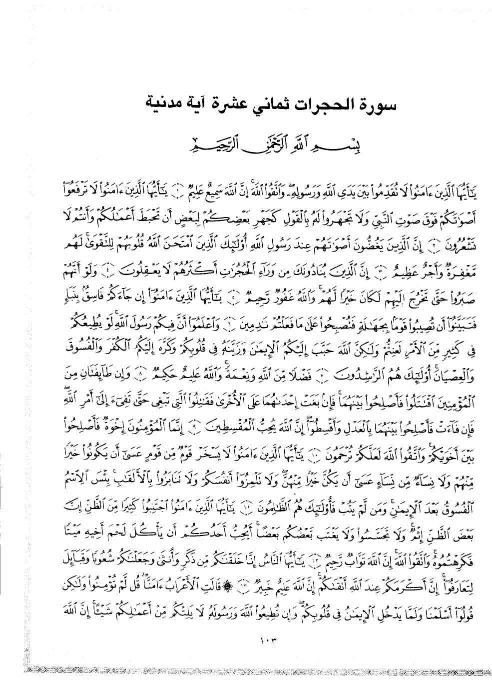 2 ( ) ياأَيُّهَا الَّذِينَ ءَامَنُواْ لاَ تُقَدِّمُواْ بَيْنَ يَدَىِ اللَّهِ وَرَسُولِهِ وَاتَّقُواْ اللَّهَ إِنَّ اللَّهَ سَمِيعٌ عَلِيمٌ ياأَيُّهَا الَّذِينَ ءَامَنُواْ لاَ تَرْفَعُواْ أَصْوَاتَكُمْ فَوْقَ صَوْتِ النَّبِىِّ وَلاَ تَجْهَرُواْ لَهُ بِالْقَوْلِ كَجَهْرِ بَعْضِكُمْ لِبَعْضٍ أَن تَحْبَطَ أَعْمَالُكُمْ وَأَنتُمْ لاَ تَشْعُرُونَ إِنَّ الَّذِينَ يَغُضُّونَ أَصْوَاتَهُمْ عِندَ رَسُولِ اللَّهِ أُوْلَائِكَ الَّذِينَ امْتَحَنَ اللَّهُ قُلُوبَهُمْ لِلتَّقْوَى لَهُم مَّغْفِرَةٌ وَأَجْرٌ عَظِيمٌ إَنَّ الَّذِينَ يُنَادُونَكَ مِن وَرَآءِ الْحُجُرَاتِ أَكْثَرُهُمْ لاَ يَعْقِلُونَ وَلَوْ أَنَّهُمْ صَبَرُواْ حَتَّى تَخْرُجَ إِلَيْهِمْ لَكَانَ خَيْراً لَّهُمْ وَاللَّهُ غَفُورٌ رَّحِيمٌ ياأَيُّهَا الَّذِينَ ءَامَنُواْ إِن جَآءَكُمْ فَاسِقُ بِنَبَإٍ فَتَبَيَّنُواْ أَن تُصِيببُواْ قَوْمَا بِجَهَالَةٍ فَتُصْبِحُواْ عَلَى مَا فَعَلْتُمْ نَادِمِينَ وَاعْلَمُواْ أَنَّ فِيكُمْ رَسُولَ اللَّهِ لَوْ يُطِيعُكُمْ فِى كَثِيرٍ مِّنَ الاٌّ مْرِ لَعَنِتُّمْ وَلَاكِنَّ اللَّهَ حَبَّبَ إِلَيْكُمُ الايمَانَ وَزَيَّنَهُ فِى قُلُوبِكُمْ وَكَرَّهَ إِلَيْكُمُ الْكُفْرَ وَالْفُسُوقَ وَالْعِصْيَانَ أُوْلَائِكَ هُمُ الرَاشِدُونَ فَضْلاً مِّنَ اللَّهِ وَنِعْمَةً وَاللَّهُ عَلِيمٌ حَكِيمٌ وَإِن طَآئِفَتَانِ مِنَ الْمُؤْمِنِينَ اقْتَتَلُواْ فَأَصْلِحُواْ بَيْنَهُمَا فَإِن بَغَتْ إِحْدَاهُمَا عَلَى الأُخْرَى فَقَاتِلُواْ الَّتِى تَبْغِى حَتَّى تَفِىءَ إِلَى أَمْرِ اللَّهِ فَإِن فَآءَتْ فَأَصْلِحُواْ بَيْنَهُمَا بِالْعَدْلِ وَأَقْسِطُواْ إِنَّ اللَّهَ يُحِبُّ الْمُقْسِطِينَ إِنَّمَا الْمُؤْمِنُونَ إِخْوَةٌ فَأَصْلِحُواْ بَيْنَ أَخَوَيْكُمْ وَاتَّقُواْ اللَّهَ لَعَلَّكُمْ تُرْحَمُونَ ياأَيُّهَا الَّذِينَ ءَامَنُواْ لاَ يَسْخَرْ قَوْمٌ مِّن قَوْمٍ عَسَى أَن يَكُونُواْ خَيْراً مِّنْهُمْ وَلاَ نِسَآءٌ مِّن نِّسَآءٍ عَسَى أَن يَكُنَّ خَيْراً مِّنْهُنَّ وَلاَ تَلْمِزُواْ أَنفُسَكُمْ وَلاَ تَنَابَزُواْ بِالاٌّ لْقَابِ بِئْسَ الاسْمُ الْفُسُوقُ بَعْدَ الايمَانِ وَمَن لَّمْ يَتُبْ فَأُوْلَائِكَ هُمُ الظَّالِمُونَ ياأَيُّهَا الَّذِينَ ءَامَنُواْ اجْتَنِبُواْ كَثِيراً مِّنَ الظَّنِّ إِنَّ بَعْضَ الظَّنِّ إِثْمٌ وَلاَ تَجَسَّسُواْ وَلاَ يَغْتَب بَّعْضُكُم بَعْضاً أَيُحِبُّ أَحَدُكُمْ أَن يَأْكُلَ لَحْمَ أَخِيهِ مَيْتاً فَكَرِهْتُمُوهُ وَاتَّقُواْ اللَّهَ إِنَّ اللَّهَ تَوَّابٌ رَّحِيمٌ ياأَيُّهَا النَّاسُ إِنَّا خَلَقْنَاكُم مِّن ذَكَرٍ وَأُنْثَى وَجَعَلْنَاكُمْ شُعُوباً وَقَبَآئِلَ لِتَعَارَفُواْ إِنَّ أَكْرَمَكُمْ عَندَ اللَّهِ أَتْقَاكُمْ إِنَّ اللَّهَ عَلِيمٌ خَبِيرٌ قَالَتِ الاٌّ عْرَابُ ءَامَنَّا قُل لَّمْ تُؤْمِنُواْ وَلَاكِن قُولُواْ أَسْلَمْنَا وَلَمَّا يَدْخُلِ الايمَانُ فِى قُلُوبِكُمْ وَإِن تُطِيعُواْ اللَّهَ وَرَسُولَهُ لاَ يَلِتْكُمْ مِّنْ أَعْمَالِكُمْ شَيْئاً إِنَّ اللَّه
