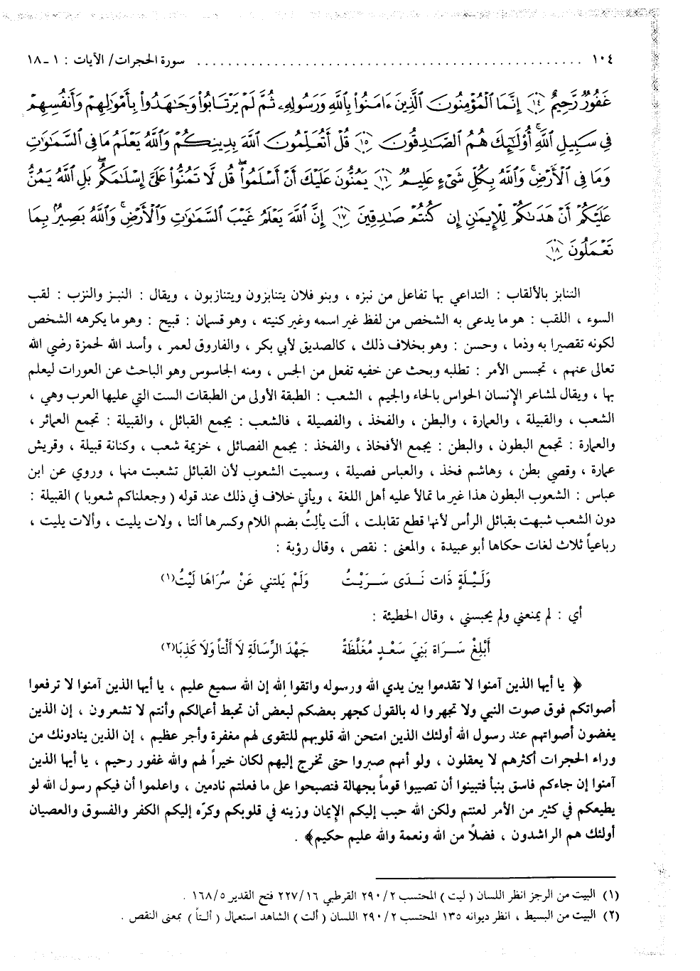 التنابز بالألقاب : التداعي بها ، تفاعل من نبزه ، وبنو فلان يتنابزون ويتنازبون ، ويقال : النبز والنزب لقب السوء . اللقب : هو ما يدعى به الشخص من لفظ غير اسمه وغير كنيته ، وهو قسمان : قبيح ، وهو ما يكرهه الشخص لكونه تقصيراً به وذماً ؛ وحسن ، وهو بخلاف ذلك ، كالصديق لأبي بكر ، والفاروق لعمر ، وأسد الله لحمزة ، رضي الله تعالى عنهم . تجسس الأمر : تطلبه وبحث عن خفيه ، تفعل من الجس ، ومنه الجاسوس : وهو الباحث عن العورات ليعلم بها ؛ ويقال لمشاعر الإنسان : الحواس ، بالحاء والجيم . الشعب : الطبقة الأولى من الطبقات الست التي عليها العرب وهي : الشعب ، والقبيلة ، والعمارة ، والبطن ، والفخذ ، والفصيلة . فالشعب يجمع القبائل ؛ والقبيلة تجمع العمائر ؛ والعمارة تجمع البطون ؛ والبطن يجمع الأفخاذ ؛ والفخذ يجمع الفصائل . خزيمة شعب ؛ وكنانة قبيلة ؛ وقريش عمارة ؛ وقصي بطن ؛ وهاشم فخذ ؛ والعباس فصيلة . وسميت الشعوب ، لأن القبائل تشعبت منها . وروي عن ابن عباس : الشعوب : البطون ، هذا غير ما تمالأ عليه أهل اللغة ، ويأتي خلاف في ذلك عند قوله : ) وَجَعَلْنَاكُمْ شُعُوباً ). القبيلة دون الشعب ، شبهت بقبائل الرأس لأنها قطع تقابلت . ألت يألت : بضم اللام وكسرها ألتاً ، ولات يليت وألات يليت ، رباعياً ، ثلاث لغات حكاها أبو عبيدة ، والمعنى نقص . وقال رؤبة : وليلة ذات ندى سريت