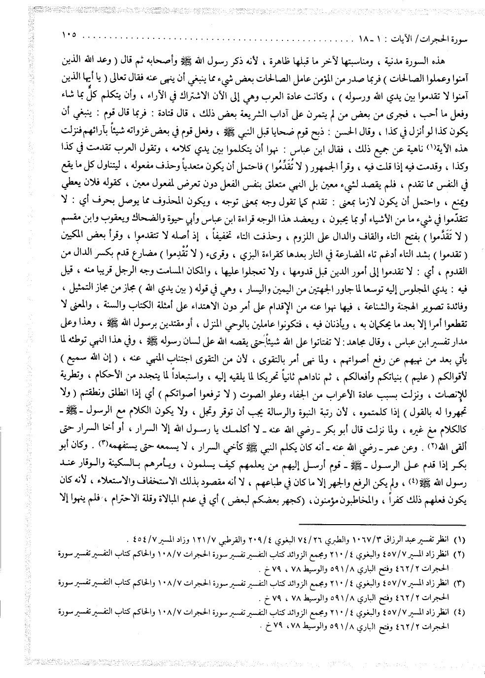 هذه السورة مدنية . ومناسبتها لآخر ما قبلها ظاهرة ، لأنه ذكر رسول الله ( صلى الله عليه وسلم ) ) وأصحابه ، ثم قال : ) وَعَدَ اللَّهُ الَّذِينَ ءامَنُواْ وَعَمِلُواْ الصَّالِحَاتِ ( ، فربما صدر من المؤمن عامل الصالحات بعض شيء مما ينبغي أن ينهى عنه ، فقال تعالى : ) عَظِيماً ياأَيُّهَا الَّذِينَ ءامَنُواْ لاَ تُقَدّمُواْ بَيْنَ يَدَىِ اللَّهِ وَرَسُولِهِ ).