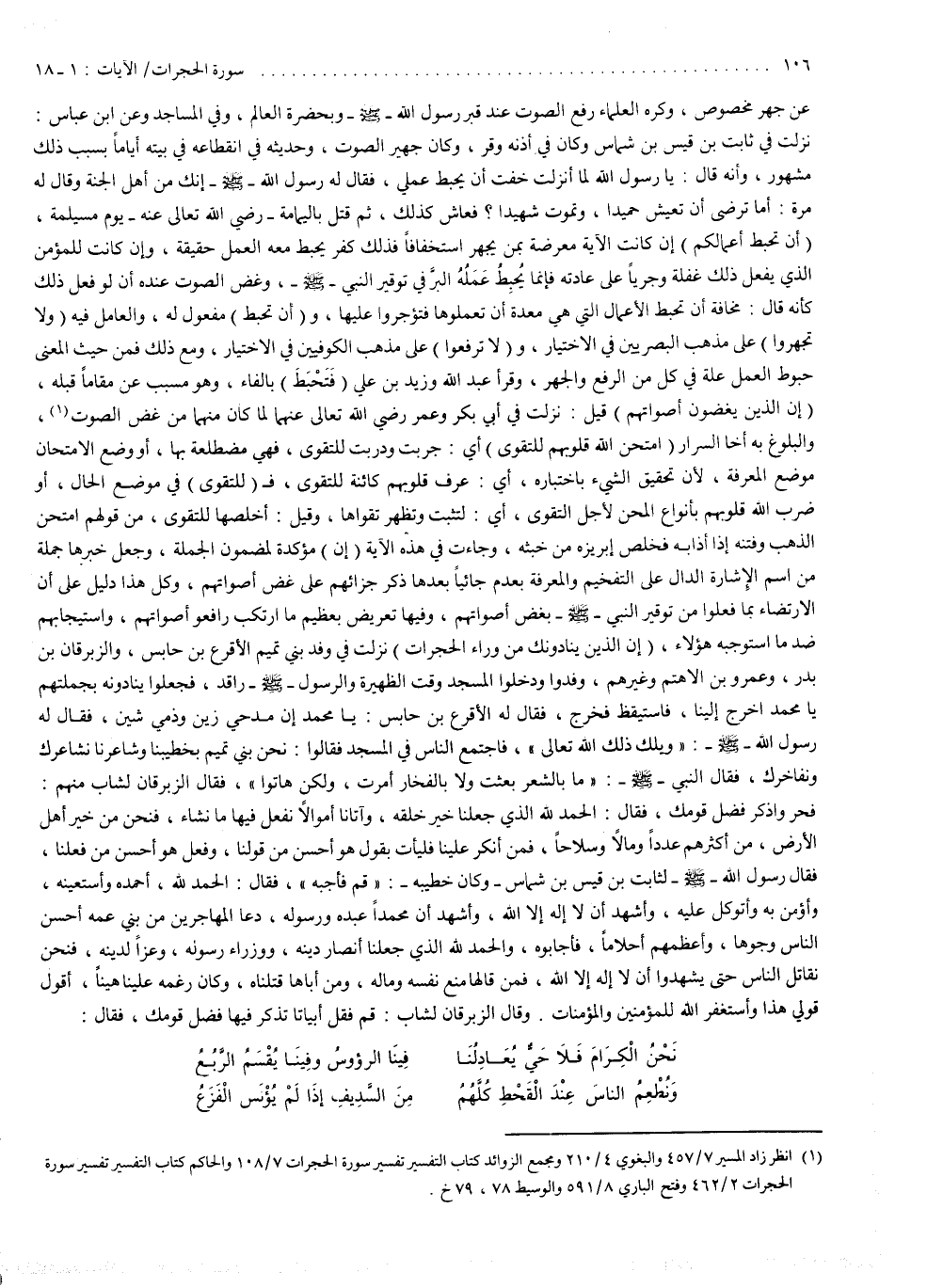 ( إَنَّ الَّذِينَ يُنَادُونَكَ مِن وَرَاء الْحُجُراتِ ( : نزلت في وفد بني تميم الأقرع بن حابس ، والزبرقان بن بدر ، وعمرو بن الأهتم وغيرهم . وفدوا ودخلوا المسجد وقت الظهيرة ، والرسول ( صلى الله عليه وسلم ) ) راقد ، فجعلوا ينادونه بجملتهم : يا محمد ، أخرج إلينا . فاستيقظ فخرج ، فقال له الأقرع بن حابس : يا محمد ، إن مدحي زين وذمي شين ، فقال له رسول الله ( صلى الله عليه وسلم ) ) : ( ويلك ذلك الله تعالى ) . فاجتمع الناس في المسجد فقالوا : نحن بني تميم بخطيبنا وشاعرنا ، نشاعرك ونفاخرك ؛ فقال النبي ( صلى الله عليه وسلم ) ) : ( ما بالشعر بعثت ، ولا بالفخار أمرت ، ولكن هاتوا ) . فقال الزبرقان لشاب منهم : فخروا ذكر فضل قومك ، فقال : الحمد لله الذي جعلنا خير خلقه ، وآتانا أموالاً نفعل فيها ما نشاء ، فنحن من خير أهل الأرض ، من أكثرهم عدداً ومالاً وسلاحاً ، فمن أنكر علينا فليأت بقول هو أحسن من قولنا ، وفعل هو أحسن من فعلنا . فقال رسول الله ( صلى الله عليه وسلم ) ) ، لثابت بن قيس بن شماس ، وكان خطيبه : ( قم فأجبه ) ، فقال : ( الحمد لله أحمده وأستعينه وأومن به وأتوكل عليه ، وأشهد أن لا إله إلا الله ، وأشهد أن محمداً عبده ورسوله ، دعا المهاجرين من بني عمه أحسن الناس وجوهاً وأعظمهم أحلاماً فأجابوه ، والحمد لله الذي جعلنا أنصار دينه ووزراء رسوله وعزاً لدينه ، فنحن نقاتل الناس حتى يشهدوا أن لا أله إلا الله ، فمن قالها منع نفسه وماله ، ومن أباها قتلناه وكان رغمه علينا هيناً ، أقول قولي هذا وأستغفر الله للمؤمنين والمؤمنات ) . وقال الزبرقان لشاب : قم فقل أبياتاً تذكر فيها فضل قومك ، فقال : نحن الكرام فلا حي يعادلنا