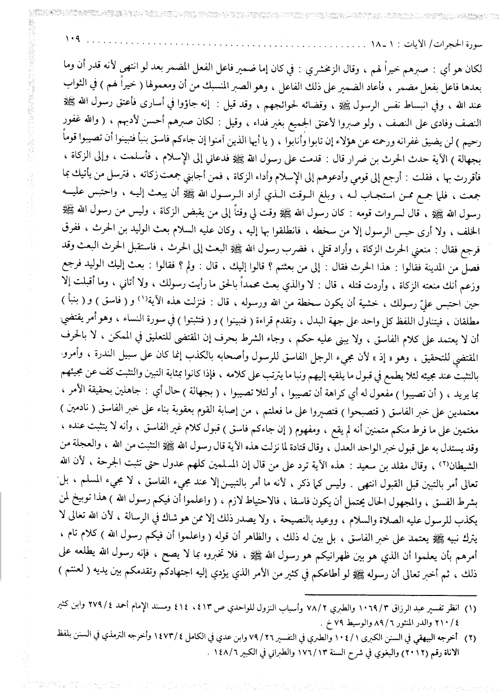 ( ياأَيُّهَا الَّذِينَ ءامَنُواْ إِن جَاءكُمْ فَاسِقُ بِنَبَإٍ فَتَبَيَّنُواْ أَن تُصِيببُواْ قَوْمَا بِجَهَالَةٍ ( الآية ، حدث الحرث بن ضرار قال : قدمت على رسول الله ( صلى الله عليه وسلم ) ) ، فدعاني إلى الإسلام ، فأسلمت ، وإلى الزكاة فأقررت بها ، فقلت : أرجع إلى قومي وأدعوهم إلى الإسلام وأداء الزكاة ، فمن أجابني جمعت زكاته ، فترسل من يأتيك بما جمعت . فلما جمع ممن استجاب له ، وبلغ الوقت الذي أراد الرسول ( صلى الله عليه وسلم ) ) أن يبعث إليه ، واحتبس عليه رسول الله ( صلى الله عليه وسلم ) ) ، قال لسروات قومه : كان رسول الله ( صلى الله عليه وسلم ) ) وقت لي وقتاً إلى من يقبض الزكاة ، وليس من رسول الله ( صلى الله عليه وسلم ) ) الخلف ، ولا أرى حبس الرسول إلا من سخطه . فانطلقوا بها إليه ، وكان عليه السلام البعث بعث الوليد بن الحرث ، ففرق ، فرجع فقال : منعني الحرث الزكاة وأراد قتلي ، فضرب رسول الله ( صلى الله عليه وسلم ) ) إلى الحرث ، فاستقبل الحرث البعث وقد فصل من المدينة ، فقالوا : هذا الحرث ، إلى من بعثتم ؟ قالوا : إليك قال : ولم ؟ فقالوا : بعث إليك الوليد ، فرجع وزعم أنك منعته الزكاة وأردت قتله ، قال : لا والذي بعث محمداً بالحق ما رأيت رسولك ، ولا أتاني ، وما أقبلت إلا حين احتبس عليّ رسولك خشية أن يكون سخطة من الله ورسوله ، قال : فنزلت هذه الآية .