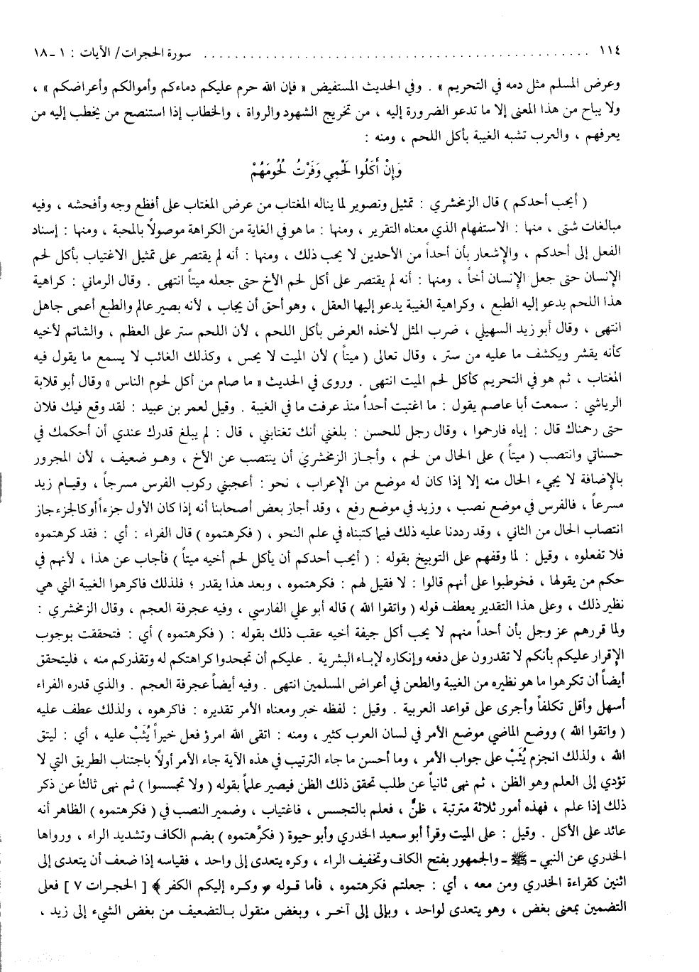 وقال تعالى : ) مَيْتًا ( ، لأن الميت لا يحس ، وكذلك الغائب لا يسمع ما يقول فيه المغتاب ، ثم هو في التحريم كآكل لحم الميت . انتهى . وروي في الحديث : ( ما صام من أكل لحوم الناس ) . وقال أبو قلابة الرياشي : سمعت أبا عاصم يقول : ما اغتبت أحداً منذ عرفت ما في الغيبة . وقيل : لعمر بن عبيد : لقد وقع فيك فلان حتى رحمناك ، قال : إياه فارحموا . وقال رجل للحسن : بلغني أنك تغتابني ، قال : لم يبلغ قدرك عندي أن أحكمك في حسناتي . وانتصب ميتاً على الحال من لحم ، وأجاز الزمخشري أن ينتصب عن الأخ ، وهو ضعيف ، لأن المجرور بالإضافة لا يجيء الحال منه إلا إذا كان له موضع من الإعراب ، نحو : أعجبني ركوب الفرس مسرجاً ، وقيام زيد مسرعاً . فالفرس في موضع نصب ، وزيد في موضع رفع . وقد أجاز بعض أصحابنا أنه إذا كان الأول جزأ أو كالجزء ، جاز انتصاب الحال من الثاني ، وقد رددنا عليه ذلك فيما كتبناه في علم النحو . ) فَكَرِهْتُمُوهُ ( ، قال الفراء : أي فقد كرهتموه ، فلا تفعلون . وقيل : لما وقفهم على التوبيخ بقوله : ) أَيُحِبُّ أَحَدُكُمْ أَن يَأْكُلَ لَحْمَ أَخِيهِ مَيْتاً ( ، فأجاب عن هذا : لأنهم في حكم من يقولها ، فخوطبوا على أنهم قالوا لا ، فقيل لهم : فكرهتموه ، وبعد هذا يقدر فلذلك فاكرهوا الغيبة التي هي نظير ذلك . وعلى هذا التقدير يعطف قوله : ) وَاتَّقُواْ اللَّهَ ( ، قاله أبو علي الفارسي ، وفيه عجرفة العجم .