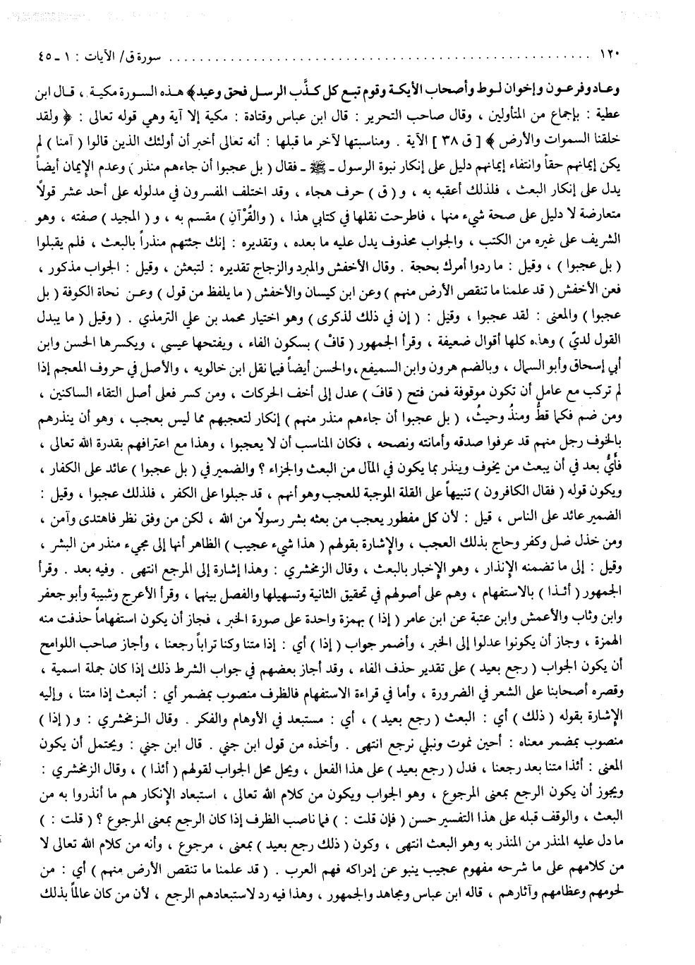 ( بَلْ عَجِبُواْ ( ، وقيل : ما ردوا أمرك بحجة . وقال الأخفش ، والمبرد ، والزجاج : تقديره لتبعثن . وقيل : الجواب مذكور ، فعن الأخفش قد علمنا ما تنقص الأرض منهم ؛ وعن ابن كيسان ، والأخفش : ما يلفظ من قول ؛ وعن نحاة الكوفة : بل عجبوا ، والمعنى : لقد عجبوا . وقيل : إن في ذلك لذكرى ، وهو اختيار محمد بن علي الترمذي . وقيل : ما يبدل القول لديّ ، وهذه كلها أقوال ضعيفة . وقرأ الجمهور : قاف بسكون الفاء ، ويفتحها عيسى ، ويكسرها الحسن وابن أبي إسحاق وأبو السمال ؛ وبالضم : هارون وابن السميفع والحسن أيضاً ؛ فيما نقل ابن خالويه . والأصل في حروف المعجم ، إذا لم تركب مع عامل ، أن تكون موقوفة . فمن فتح قاف ، عدل إلى الحركات ؛ ومن كسر ، فعلى أصل التقاء الساكنين ؛ ومن ضم ، فكما ضم قط ومنذ وحيث .