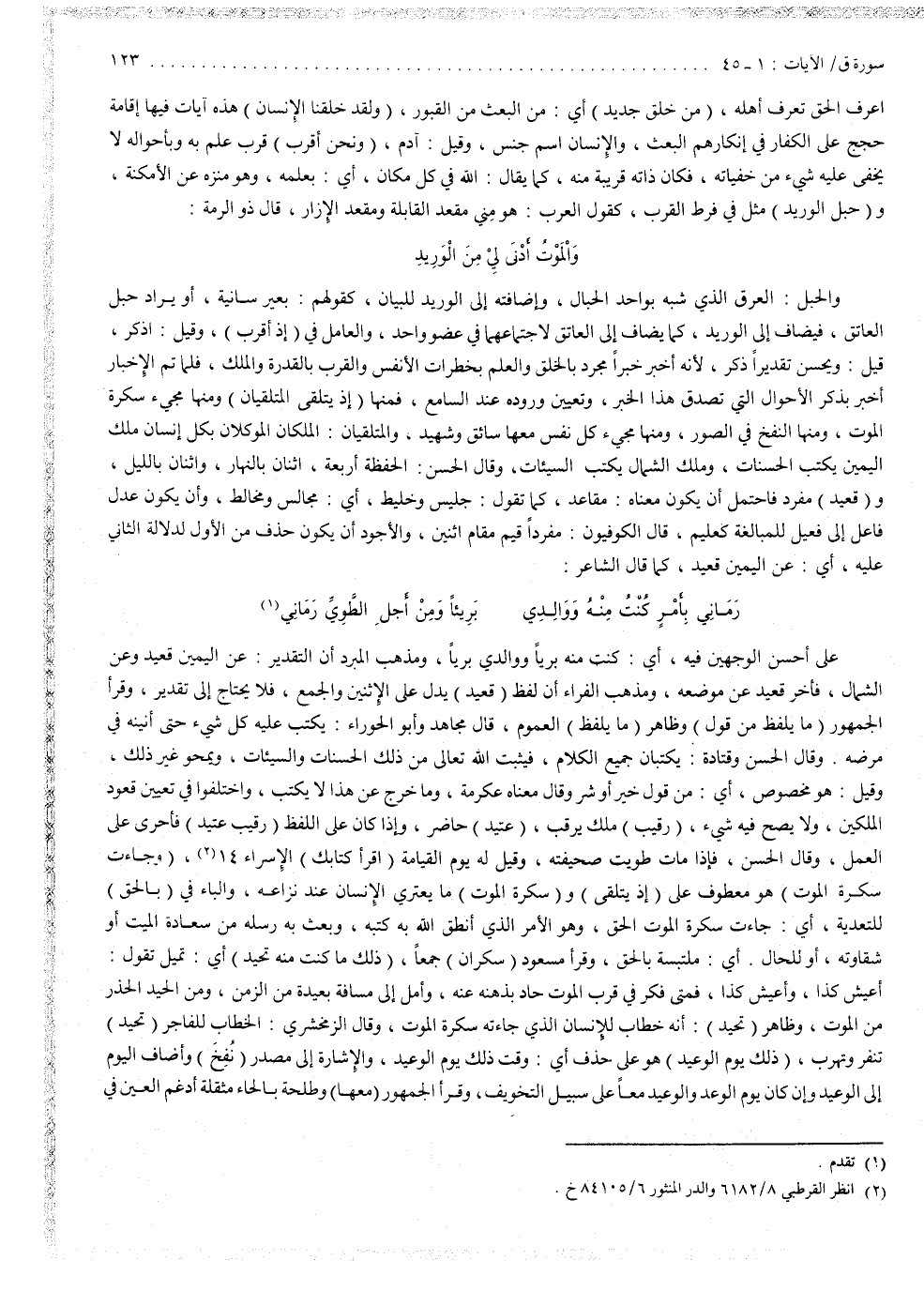 ( وَلَقَدْ خَلَقْنَا الإِنْسَانَ ( : هذه آيات فيها إقامة حجج على الكفار في إنكارهم البعث ، والإنسان إسم جنس . وقيل : آدم . ) وَنَحْنُ أَقْرَبُ ( : قرب علم به وبأحواله ، لا يخفى عليه شيء من خفياته ، فكأن ذاته قريبة منه ، كما يقال : الله في كل مكان ، أي بعلمه ، وهو منزه عن الأمكنة . و ) حَبْلِ الْوَرِيدِ ( : مثل في فرط القرب ، كقول العرب : هو مني مقعد القابلة ، ومقعد الإزار . قال ذو الرمة :