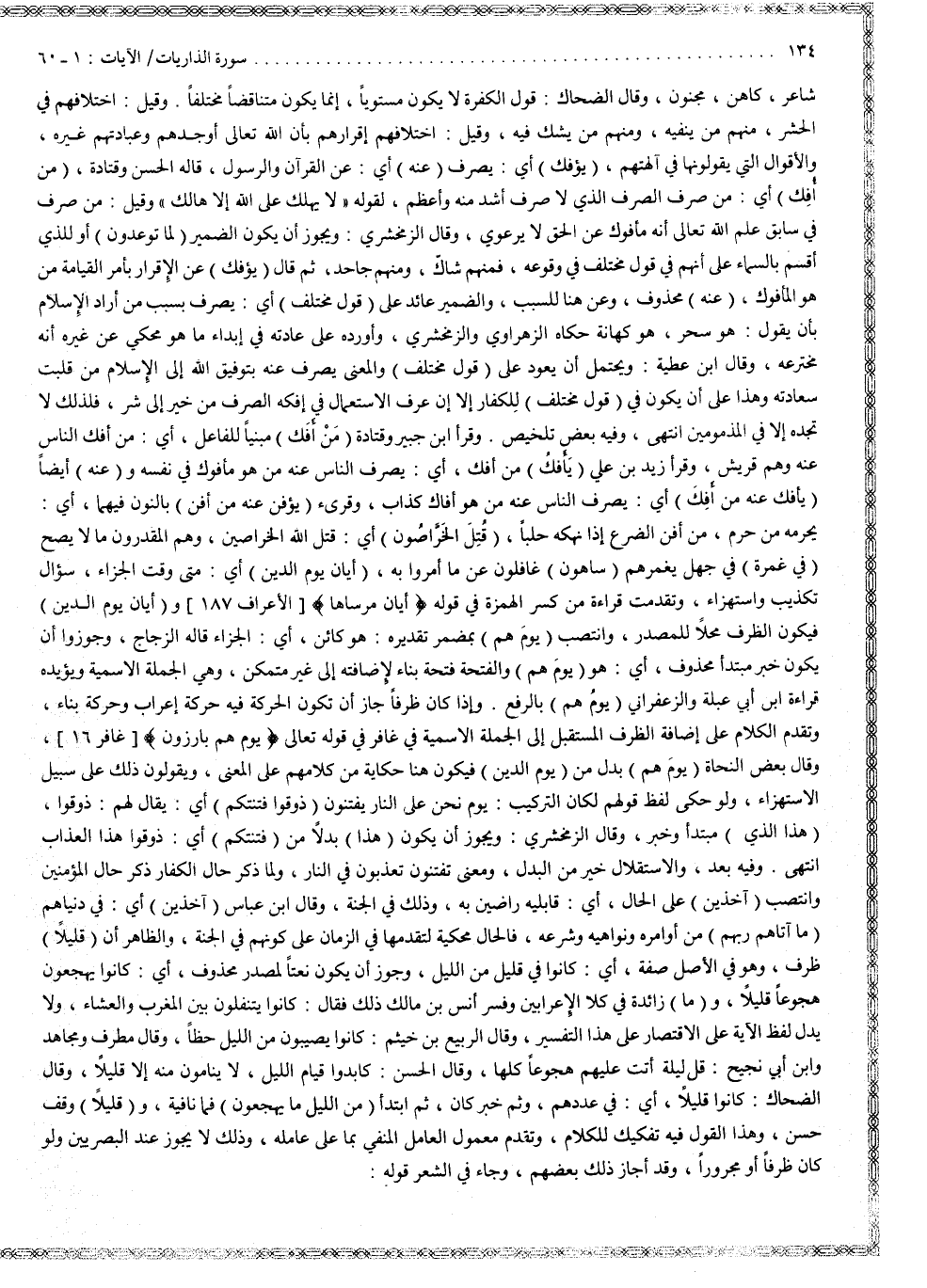 ( يُؤْفَكُ ( : أي يصرف عنه ، أي عن القرآن والرسول ، قاله الحسن وقتادة . ) مَنْ أُفِكَ ( : أي من صرف الصرف الذي لا صرف أشد منه وأعظم لقوله : لا يهلك على الله إلا هالك . وقيل : من صرف في سابق علم الله تعالى أنه مأفوك عن الحق لا يرعوي . وقال الزمخشري : ويجوز أن يكون الضمير لما توعدون ، أو للذي أقسم بالسماء على أنهم في قول مختلف في وقوعه ، فمنهم شاك ومنهم جاحد . ثم قال : يؤفك عن الإقرار بأمر القيامة من هو المأفوك . وقيل : المأفوك عنه محذوف ، وعن هنا للسبب ، والضمير عائد على ) قَوْلٍ مُّخْتَلِفٍ ( ، أي يصرف بسببه من أراد الإسلام بأن يقول : هو سحر هو كهانة ، حكاه الزهراوي والزمخشري ، وأورده على عادته في إبداء ما هو محكي عن غيره أنه مخترعه . وقال ابن عطية : ويحتمل أن يعود على ) قَوْلٍ مُّخْتَلِفٍ ( ، والمعنى : يصرف عنه بتوفيق الله إلى الإسلام من غلبت سعادته ، وهذا على أن يكون في قول مختلف للكفار ، إلا أن عرف الاستعمال في إفكه الصرف من خير إلى شر ، فلذلك لا تجده إلا في المذمومين . انتهى ، وفيه بعض تلخيص . وقرأ ابن جبير وقتادة : من أفك مبنياً للفاعل ، أي من أفك الناس عنه ، وهم قريش . وقرأ زيد بن علي : يأفك عنه من أفك ، أي يصرف الناس عنه من هو مأفوك في نفسه . وعنه أيضاً : يأفك عنه من أفك ، أي يصرف الناس عنه من هو أفاك كذاب . وقرىء : يؤفن عنه من أفن بالنون فيهما ، أي يحرمه من حرم من أفن الضرع إذا نهكه حلباً .