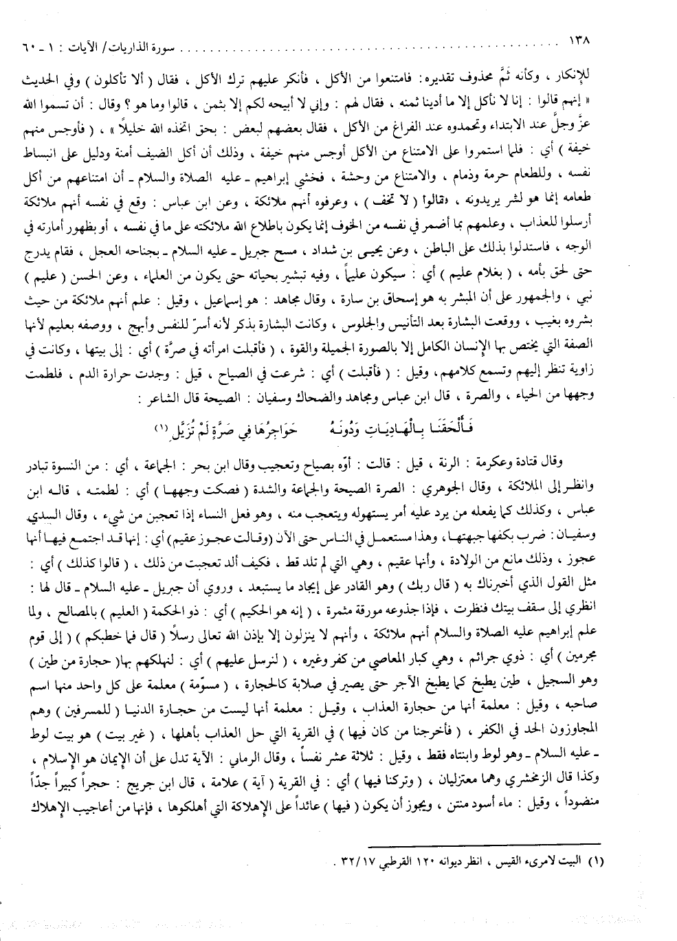 ( فَأَوْجَسَ مِنْهُمْ خِيفَةً ( : أي فلما استمروا على الامتناع من الأكل ، أوجس منهم خيفة ، وذلك أن أكل الضيف أمنة ودليل على انبساط نفسه ، وللطعام حرمة وذمام ، والامتناع منه وحشة . فخشي إبراهيم عليه الصلاة والسلام أن امتناعهم من أكل طعامهم إنما هو لشر يريدونه ، فقالوا لا تخف ، وعرفوه أنهم ملائكة . وعن ابن عباس : وقع في نفسه أنهم ملائكة أرسلوا للعذاب . وعلمهم بما أضمر في نفسه من الخوف ، إنما يكون باطلاع الله ملائكته على ما في نفسه ، أو بظهور أمارته في الوجه ، فاستدلوا بذلك على الباطن . وعن يحيى بن شداد : مسح جبريل عليه السلام بجناحه العجل ، فقام يدرج حتى لحق بأمه . ) بِغُلَامٍ عَلِيمٍ ( : أي سيكون عليماً ، وفيه تبشير بحياته حتى يكون من العلماء . وعن الحسن : عليم نبي ؛ والجمهور : على أن المبشر به هو إسحاق بن سارة . وقال مجاهد : هو إسماعيل . وقيل : علم أنهم ملائكة من حيث بشروه بغيب ، ووقعت البشارة بعد التأنيس والجلوس ، وكانت البشارة بذكر ، لأنه أسر للنفس وأبهج ، ووصفه بعليم لأنها الصفة التي يختص بها الإنسان الكامل إلا بالصورة الجميلة والقوة .