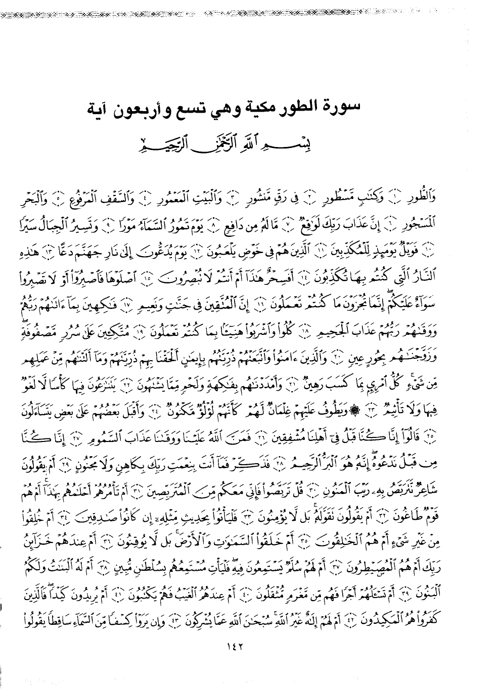 2 ( ) وَالطُّورِ وَكِتَابٍ مُّسْطُورٍ فِى رَقٍّ مَّنْشُورٍ وَالْبَيْتِ الْمَعْمُورِ وَالسَّقْفِ الْمَرْفُوعِ وَالْبَحْرِ الْمَسْجُورِ إِنَّ عَذَابَ رَبِّكَ لَوَاقِعٌ مَّا لَهُ مِن دَافِعٍ يَوْمَ تَمُورُ السَّمَآءُ مَوْراً وَتَسِيرُ الْجِبَالُ سَيْراً فَوَيْلٌ يَوْمَئِذٍ لِّلْمُكَذِّبِينَ الَّذِينَ هُمْ فِى خَوْضٍ يَلْعَبُونَ يَوْمَ يُدَعُّونَ إِلَى نَارِ جَهَنَّمَ دَعًّا هَاذِهِ النَّارُ الَّتِى كُنتُم بِهَا تُكَذِّبُونَ أَفَسِحْرٌ هَاذَا أَمْ أَنتُمْ لاَ تُبْصِرُونَ اصْلَوْهَا فَاصْبِرُواْ أَوْ لاَ تَصْبِرُواْ سَوَآءٌ عَلَيْكُمْ إِنَّمَا تُجْزَوْنَ مَا كُنتُمْ تَعْمَلُونَ إِنَّ الْمُتَّقِينَ فِى جَنَّاتٍ وَنَعِيمٍ فَاكِهِينَ بِمَآ ءَاتَاهُمْ رَبُّهُمْ وَوَقَاهُمْ رَبُّهُمْ عَذَابَ الْجَحِيمِ كُلُواْ وَاشْرَبُواْ هَنِيئَاً بِمَا كُنتُمْ تَعْمَلُونَ مُتَّكِئِينَ عَلَى سُرُرٍ مَّصْفُوفَةٍ وَزَوَّجْنَاهُم بِحُورٍ عِينٍ وَالَّذِينَ ءَامَنُواْ وَاتَّبَعَتْهُمْ ذُرِّيَّتُهُم بِإِيمَانٍ أَلْحَقْنَا بِهِمْ ذُرِّيَّتَهُمْ وَمَآ أَلَتْنَاهُمْ مِّنْ عَمَلِهِم مِّن شَىْءٍ كُلُّ امْرِىءٍ بِمَا كَسَبَ رَهَينٌ وَأَمْدَدْنَاهُم بِفَاكِهَةٍ وَلَحْمٍ مِّمَّا يَشْتَهُونَ يَتَنَازَعُونَ فِيهَا كَأْساً لاَّ لَغْوٌ فِيهَا وَلاَ تَأْثِيمٌ وَيَطُوفُ عَلَيْهِمْ غِلْمَانٌ لَّهُمْ كَأَنَّهُمْ لُؤْلُؤٌ مَّكْنُونٌ وَأَقْبَلَ بَعْضُهُمْ عَلَى بَعْضٍ يَتَسَآءَلُونَ قَالُواْ إِنَّا كُنَّا قَبْلُ فِىأَهْلِنَا مُشْفِقِينَ فَمَنَّ اللَّهُ عَلَيْنَا وَوَقَانَا عَذَابَ السَّمُومِ إِنَّا كُنَّا مِن قَبْلُ نَدْعُوهُ إِنَّهُ هُوَ الْبَرُّ الرَّحِيمُ فَذَكِّرْ فَمَآ أَنتَ بِنِعْمَةِ رَبِّكَ بِكَاهِنٍ وَلاَ مَجْنُونٍ أَمْ يَقُولُونَ شَاعِرٌ نَّتَرَبَّصُ بِهِ رَيْبَ الْمَنُونِ قُلْ تَرَبَّصُواْ فَإِنِّى مَعَكُمْ مِّنَ الْمُتَرَبِّصِينَ أَمْ تَأْمُرُهُمْ أَحْلَامُهُمْ بِهَاذَآ أَمْ هُمْ قَوْمٌ طَاغُونَ أَمْ يَقُولُونَ تَقَوَّلَهُ بَل لاَّ يُؤْمِنُونَ فَلْيَأْتُواْ بِحَدِيثٍ مِّثْلِهِ إِن كَانُواْ صَادِقِينَ أَمْ خُلِقُواْ مِنْ غَيْرِ شَىْءٍ أَمْ هُمُ الْخَالِقُونَ أَمْ خَلَقُواْ السَّمَاوَاتِ وَالاٌّ رْضَ بَل لاَّ يُوقِنُونَ أَمْ عِندَهُمْ خَزَآئِنُ رَبِّكَ أَمْ هُمُ الْمُسَيْطِرُونَ أَمْ لَهُمْ سُلَّمٌ يَسْتَمِعُونَ فِيهِ فَلْيَأْتِ مُسْتَمِعُهُم بِسُلْطَانٍ مُّبِينٍ أَمْ لَهُ الْبَنَاتُ وَلَكُمُ الْبَنُونَ أَمْ تَسْألُهُمْ أَجْراً فَهُم مِّن مَّغْرَمٍ مُّثْقَلُونَ أَمْ عِندَهُمُ الْغَيْبُ فَهُمْ يَكْتُبُونَ أَمْ يُرِيدُونَ كَيْداً فَالَّذِينَ كَفَرُواْ هُمُ الْمَكِيدُونَ أَمْ لَهُمْ إِلَاهٌ غَيْرُ اللَّهِ سُبْحَانَ اللَّهِ عَمَّا يُشْرِكُونَ وَإِن يَرَوْاْ كِسْفاً مِّنَ السَّمَآءِ سَاقِطاً يَقُولُوا