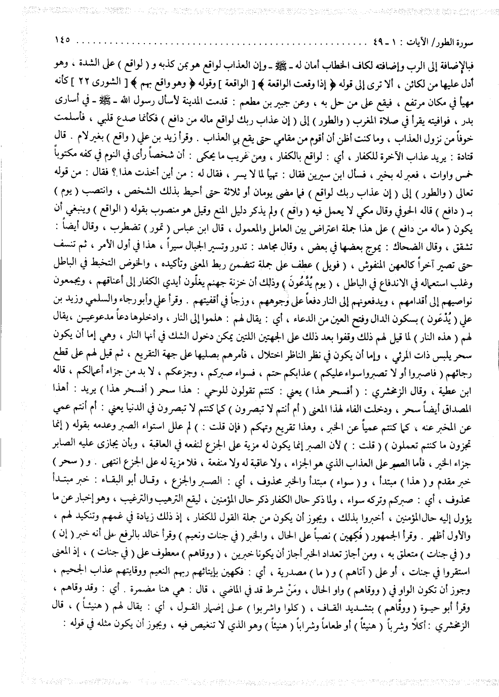 ومن غريب ما يحكى أن شخصاً رأى في النوم في كفه مكتوباً خمس واوات ، فعبر له بخير ، فسأل ابن سيرين ، فقال : تهيأ لما لا يسر ، فقال له : من أين أخذت هذا ؟ فقال : من قوله تعالى : ) وَالطُّورِ ( إلى ) إِنَّ عَذَابَ رَبّكَ لَوَاقِعٌ ( ، فما مضى يومان أو ثلاثة حتى أحيط بذلك الشخص . وانتصب يوم بدافع ، قاله الحوفي ، وقال مكي : لا يعمل فيه واقع ، ولم يذكر دليل المنع . وقيل : هو منصوب بقوله : ) لَوَاقِعٌ ( ،