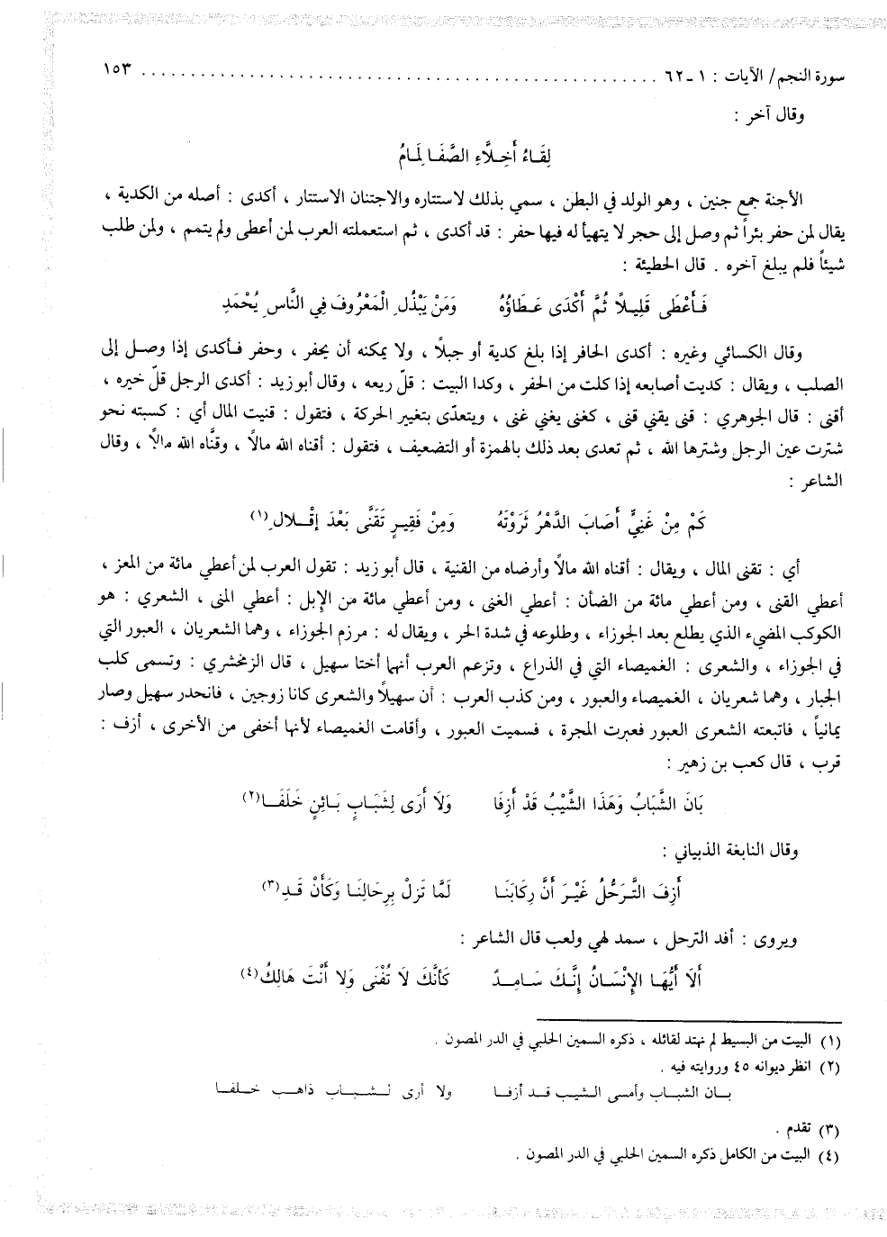 الأجنة : جمع جنين ، وهو الولد في البطن ، سمي بذلك لاستتاره ، والاجتنان : الاستتار . أكدى : أصله من الكدية ، يقال لمن حفر بئراً ثم وصل إلى حجر لا يتهيأ له فيها حفر : قد أكدى ، ثم استعملته العرب لمن أعطى ولم يتمم ، ولمن طلب شيئاً فلم يبلغ آخره . قال الحطيئة : فأعطى قليلاً ثم أكدى عطاءه