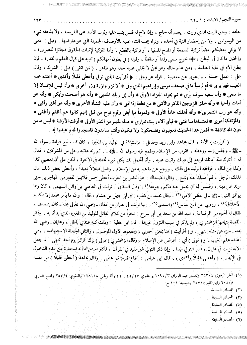 قوله عز وجل : ) أَفَرَأَيْتَ الَّذِى تَوَلَّى وَأَعْطَى قَلِيلاً وَأَكْدَى عِلْمُ الْغَيْبِ فَهُوَ يَرَى أَمْ أَمْ لَمْ يُنَبَّأْ بِمَا فِى صُحُفِ مُوسَى وَإِبْراهِيمَ الَّذِى وَفِي الاْخِرَةِ تَزِرُ وَازِرَةٌ وِزْرَ أُخْرَى وَإِن لَّيْسَ لِلإنسَانِ إِلاَّ مَا سَعَى وَأَنَّ سَعْيَهُ سَوْفَ يُرَى ثُمَّ يُجْزَاهُ الْجَزَاء الاوْفَى وَأَنَّ إِلَى رَبّكَ الْمُنتَهَى وَأَنَّهُ هُوَ أَضْحَكَ وَأَبْكَى وَأَنَّهُ هُوَ أَمَاتَ وَأَحْيَا وَأَنَّهُ خَلَقَ الزَّوْجَيْنِ الذَّكَرَ وَالاْنثَى مِن نُّطْفَةٍ إِذَا تُمْنَى وَأَنَّ عَلَيْهِ النَّشْأَةَ الاْخْرَى وَأَنَّهُ هُوَ أَغْنَى وَأَقْنَى وَأَنَّهُ هُوَ رَبُّ الشّعْرَى وَأَنَّهُ أَهْلَكَ عَاداً الاْولَى وَثَمُودَاْ فَمَا أَبْقَى وَقَوْمَ نُوحٍ مّن قَبْلُ إِنَّهُمْ كَانُواْ هُمْ أَظْلَمَ وَأَطْغَى وَالْمُؤْتَفِكَةَ أَهْوَى فَغَشَّاهَا مَا غَشَّى فَبِأَىّ الاء رَبّكَ تَتَمَارَى هَاذَا نَذِيرٌ مّنَ النُّذُرِ الاْوْلَى أَزِفَتِ الاْزِفَةُ لَيْسَ لَهَا مِن دُونِ اللَّهِ كَاشِفَةٌ أَفَمِنْ هَاذَا الْحَدِيثِ تَعْجَبُونَ وَتَضْحَكُونَ وَلاَ تَبْكُونَ وَأَنتُمْ سَامِدُونَ فَاسْجُدُواْ لِلَّهِ وَاعْبُدُواْ ).