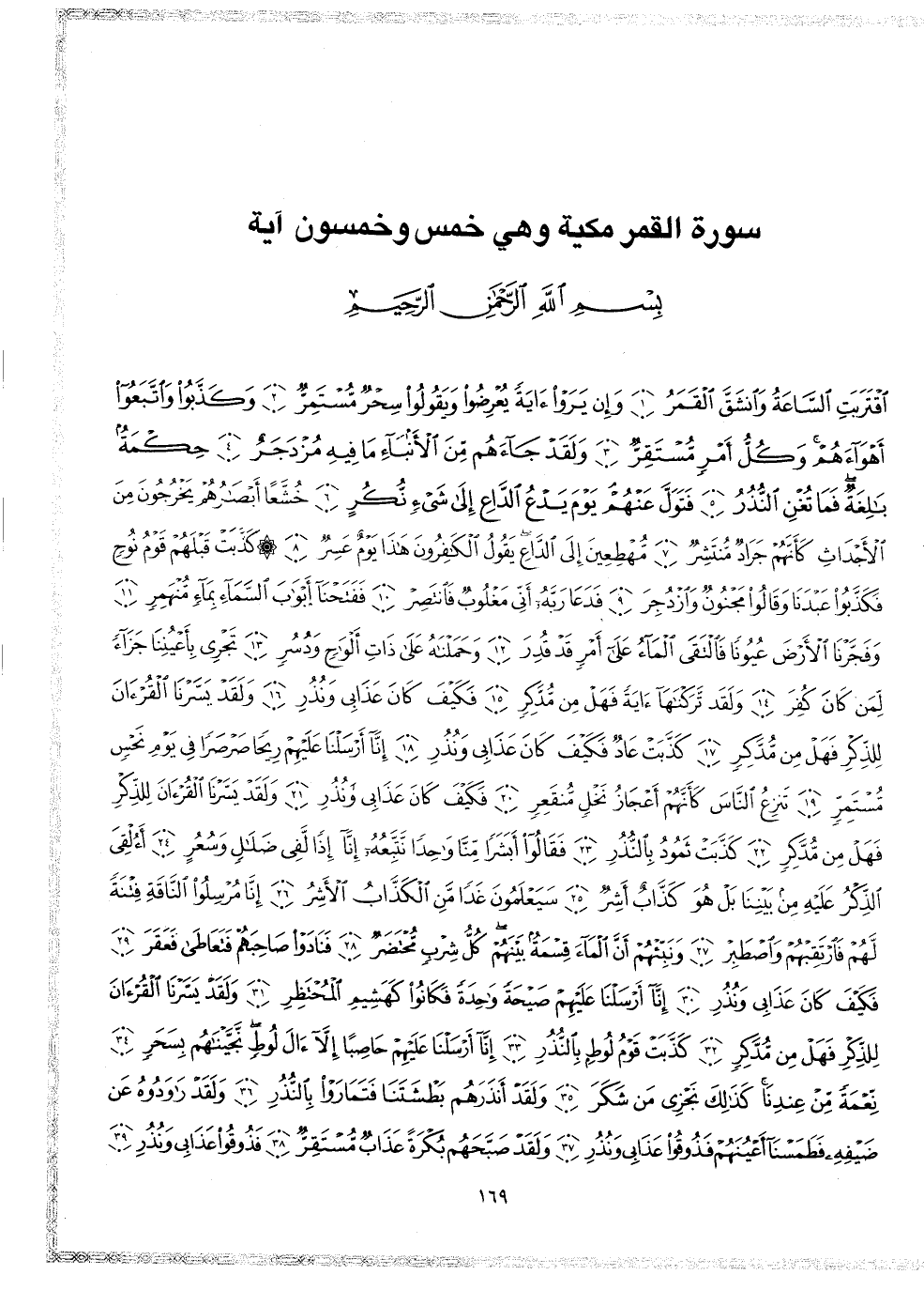 2 ( ) اقْتَرَبَتِ السَّاعَةُ وَانشَقَّ الْقَمَرُ وَإِن يَرَوْاْ ءَايَةً يُعْرِضُواْ وَيَقُولُواْ سِحْرٌ مُّسْتَمِرٌّ وَكَذَّبُواْ وَاتَّبَعُواْ أَهْوَآءَهُمْ وَكُلُّ أَمْرٍ مُّسْتَقِرٌّ وَلَقَدْ جَآءَهُم مِّنَ الاٌّ نبَآءِ مَا فِيهِ مُزْدَجَرٌ حِكْمَةٌ بَالِغَةٌ فَمَا تُغْنِى النُّذُرُ فَتَوَلَّ عَنْهُمْ يَوْمَ يَدْعُو الدَّاعِ إِلَى شَىْءٍ نُّكُرٍ خُشَّعاً أَبْصَارُهُمْ يَخْرُجُونَ مِنَ الاٌّ جْدَاثِ كَأَنَّهُمْ جَرَادٌ مُّنتَشِرٌ مُّهْطِعِينَ إِلَى الدَّاعِ يَقُولُ الْكَافِرُونَ هَاذَا يَوْمٌ عَسِرٌ كَذَّبَتْ قَبْلَهُمْ قَوْمُ نُوحٍ فَكَذَّبُواْ عَبْدَنَا وَقَالُواْ مَجْنُونٌ وَازْدُجِرَ فَدَعَا رَبَّهُ أَنُّى مَغْلُوبٌ فَانتَصِرْ فَفَتَحْنَآ أَبْوَابَ السَّمَآءِ بِمَاءٍ مُّنْهَمِرٍ وَفَجَّرْنَا الاٌّ رْضَ عُيُوناً فَالْتَقَى المَآءُ عَلَى أَمْرٍ قَدْ قُدِرَ وَحَمَلْنَاهُ عَلَى ذَاتِ أَلْوَاحٍ وَدُسُرٍ تَجْرِى بِأَعْيُنِنَا جَزَآءً لِّمَن كَانَ كُفِرَ وَلَقَدْ تَّرَكْنَاهَا ءايَةً فَهَلْ مِن مُّدَّكِرٍ فَكَيْفَ كَانَ عَذَابِى وَنُذُرِ وَلَقَدْ يَسَّرْنَا الْقُرْءَانَ لِلذِّكْرِ فَهَلْ مِن مُّدَّكِرٍ كَذَّبَتْ عَادٌ فَكَيْفَ كَانَ عَذَابِى وَنُذُرِ إِنَّآ أَرْسَلْنَا عَلَيْهِمْ رِيحاً صَرْصَراً فِى يَوْمِ نَحْسٍ مُّسْتَمِرٍّ تَنزِعُ النَّاسَ كَأَنَّهُمْ أَعْجَازُ نَخْلٍ مُّنقَعِرٍ فَكَيْفَ كَانَ عَذَابِى وَنُذُرِ وَلَقَدْ يَسَّرْنَا الْقُرْءَانَ لِلذِّكْرِ فَهَلْ مِن مُّدَّكِرٍ كَذَّبَتْ ثَمُودُ بِالنُّذُرِ فَقَالُواْ أَبَشَراً مِّنَّا وَاحِداً نَّتَّبِعُهُ إِنَّآ إِذاً لَّفِى ضَلَالٍ وَسُعُرٍ أَءُلْقِىَ الذِّكْرُ عَلَيْهِ مِن بَيْنِنَا بَلْ هُوَ كَذَّابٌ أَشِرٌ سَيَعْلَمُونَ غَداً مَّنِ الْكَذَّابُ الاٌّ شِرُ إِنَّا مُرْسِلُواْ النَّاقَةِ فِتْنَةً لَّهُمْ فَارْتَقِبْهُمْ وَاصْطَبِرْ وَنَبِّئْهُمْ أَنَّ الْمَآءَ قِسْمَةٌ بَيْنَهُمْ كُلُّ شِرْبٍ مُّحْتَضَرٌ فَنَادَوْاْ صَاحِبَهُمْ فَتَعَاطَى فَعَقَرَ فَكَيْفَ كَانَ عَذَابِى وَنُذُرِ إِنَّآ أَرْسَلْنَا عَلَيْهِمْ صَيْحَةً وَاحِدَةً فَكَانُواْ كَهَشِيمِ الْمُحْتَظِرِ وَلَقَد يَسَّرْنَا الْقُرْءَانَ لِلذِّكْرِ فَهَلْ مِن مُّدَّكِرٍ كَذَّبَتْ قَوْمُ لُوطٍ بِالنُّذُرِ إِنَّآ أَرْسَلْنَا عَلَيْهِمْ حَاصِباً إِلاَّ آلَ لُوطٍ نَّجَّيْنَاهُم بِسَحَرٍ نِّعْمَةً مِّنْ عِندِنَا كَذَلِكَ نَجْزِى مَن شَكَرَ وَلَقَدْ أَنذَرَهُمْ بَطْشَتَنَا فَتَمَارَوْاْ بِالنُّذُرِ وَلَقَدْ رَاوَدُوهُ عَن ضَيْفِهِ فَطَمَسْنَآ أَعْيُنَهُمْ فَذُوقُواْ عَذَابِى وَنُذُرِ وَلَقَدْ صَبَّحَهُم بُكْرَةً عَذَابٌ مُّسْتَقِرٌّ فَذُوقُواْ عَذَابِى وَنُذُرِ