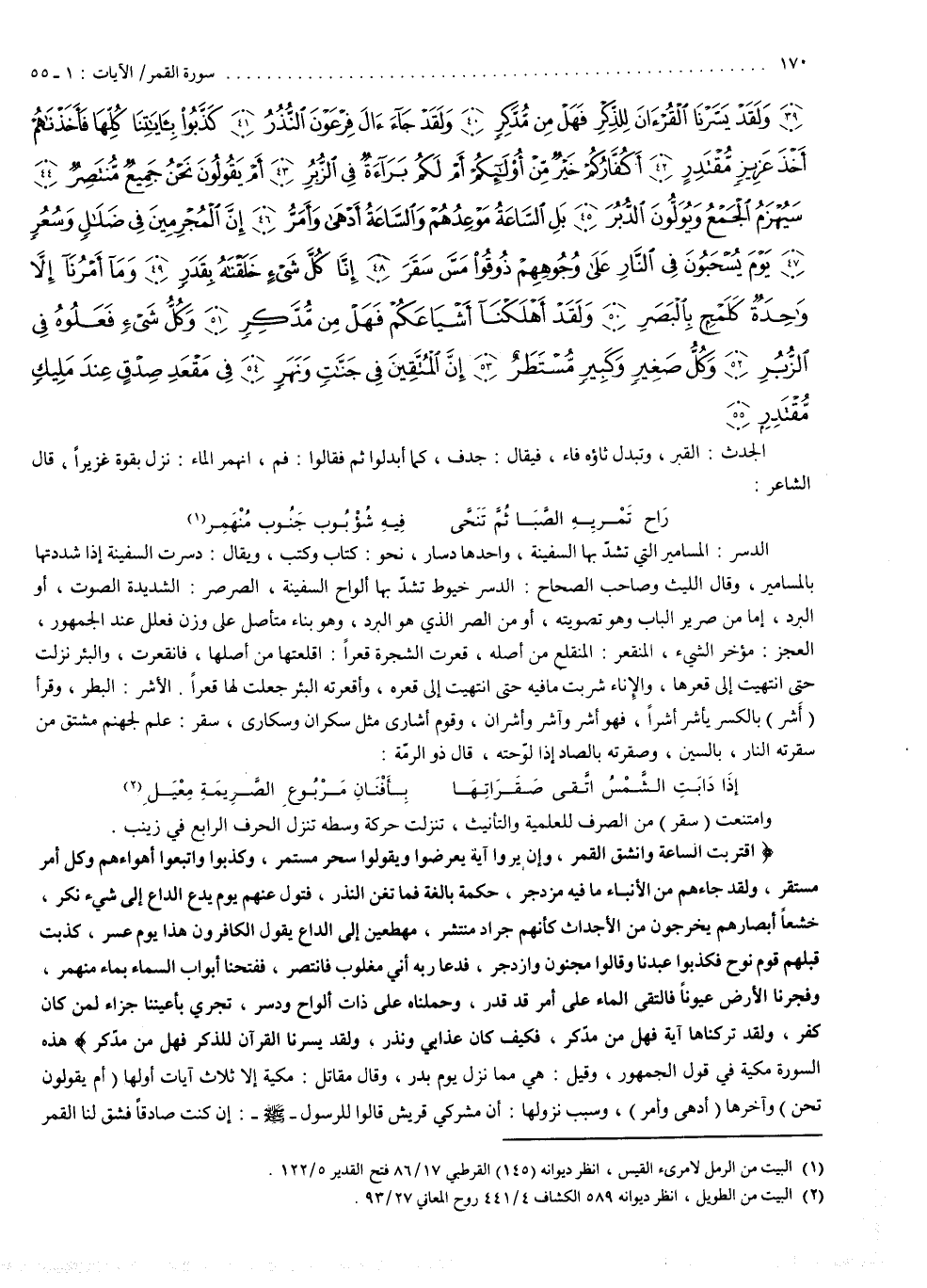 وَلَقَدْ يَسَّرْنَا الْقُرْءَانَ لِلذِّكْرِ فَهَلْ مِن مُدَّكِرٍ وَلَقَدْ جَآءَ ءَالَ فِرْعَوْنَ النُّذُرُ كَذَّبُواْ بِأايَاتِنَا كُلِّهَا فَأَخَذْنَاهُمْ أَخْذَ عِزِيزٍ مُّقْتَدِرٍ أَكُفَّارُكُمْ خَيْرٌ مِّنْ أُوْلَائِكُمْ أَمْ لَكُم بَرَآءَةٌ فِى الزُّبُرِ أَمْ يَقُولُونَ نَحْنُ جَمِيعٌ مُّنتَصِرٌ سَيُهْزَمُ الْجَمْعُ وَيُوَلُّونَ الدُّبُرَ بَلِ السَّاعَةُ مَوْعِدُهُمْ وَالسَّاعَةُ أَدْهَى وَأَمَرُّ إِنَّ الْمُجْرِمِينَ فِى ضَلَالٍ وَسُعُرٍ يَوْمَ يُسْحَبُونَ فِى النَّارِ عَلَى وُجُوهِهِمْ ذُوقُواْ مَسَّ سَقَرَ إِنَّا كُلَّ شَىْءٍ خَلَقْنَاهُ بِقَدَرٍ وَمَآ أَمْرُنَآ إِلاَّ وَاحِدَةٌ كَلَمْحٍ بِالْبَصَرِ وَلَقَدْ أَهْلَكْنَآ أَشْيَاعَكُمْ فَهَلْ مِن مُّدَّكِرٍ وَكُلُّ شَىْءٍ فَعَلُوهُ فِى الزُّبُرِ وَكُلُّ صَغِيرٍ وَكَبِيرٍ مُّسْتَطَرٌ إِنَّ الْمُتَّقِينَ فِى جَنَّاتٍ وَنَهَرٍ فِى مَقْعَدِ صِدْقٍ عِندَ مَلِيكٍ مُّقْتَدِرِ ( )
