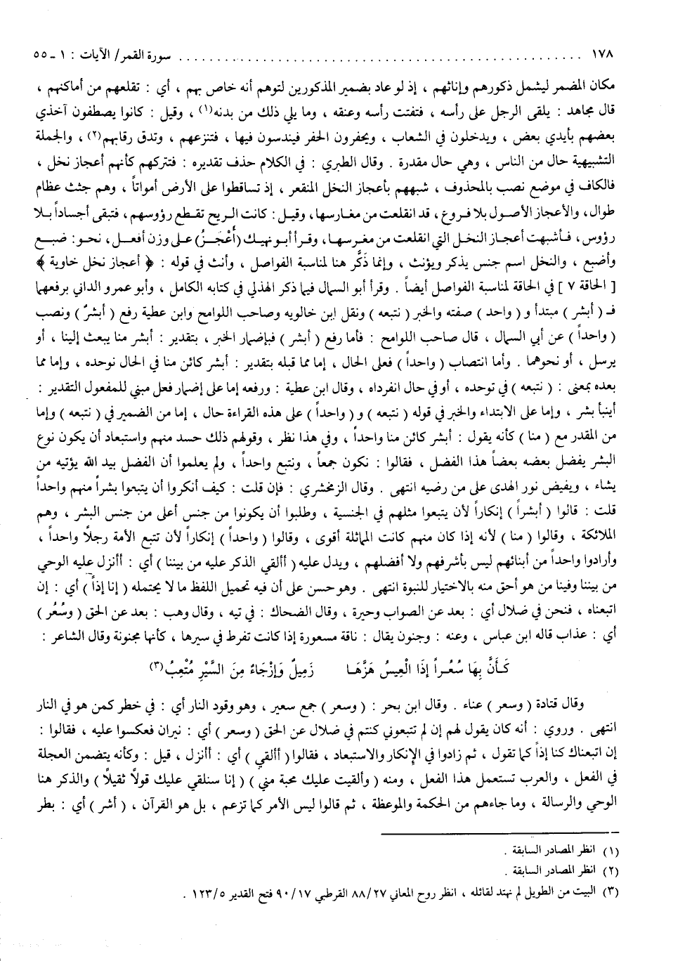 وقال الزمخشري : فإن قلت : كيف أنكروا أن يتبعوا بشراً منهم واحداً ؟ قلت : قالوا : أبشراً إنكاراً ؟ لأن يتبعوا مثلهم في الجنسية ، وطلبوا أن يكونوا من جنس أعلى من جنس البشر ، وهم الملائكة ، وقالوا منا ، لأنه إذا كان منهم ، كانت المماثلة أقوى ، وقالوا واحداً إنكاراً ، لأن تتبع الأمة رجلاً واحداً ، وأرادوا واحداً من أبنائهم ليس بأشرفهم ولا أفضلهم ، ويدل عليه . ) الذّكْرُ عَلَيْهِ مِن بَيْنِنَا بَلْ ( : أي أأنزل عليه الوحي من بيننا ؟ وفينا من هو أحق منه بالاختيار للنبوة . انتهى ، وهو حسن ، على أن فيه تحميل اللفظ ما لا يحتمله . ) إِنَّا إِذَا ( : أي إن اتبعناه ، فنحن في ضلال : أي بعد عن الصواب وحيرة . وقال الضحاك : في تيه . وقال وهب : بعد عن الحق ، ( وَسُعُرٍ ( : أي عذاب ، قاله ابن عباس . وعنه وجنون يقال : ناقة مسعورة إذا كانت تفرط في سيرها كأنها مجنونة ، وقال الشاعر : كأن بها سعراً إذا العيس هزها