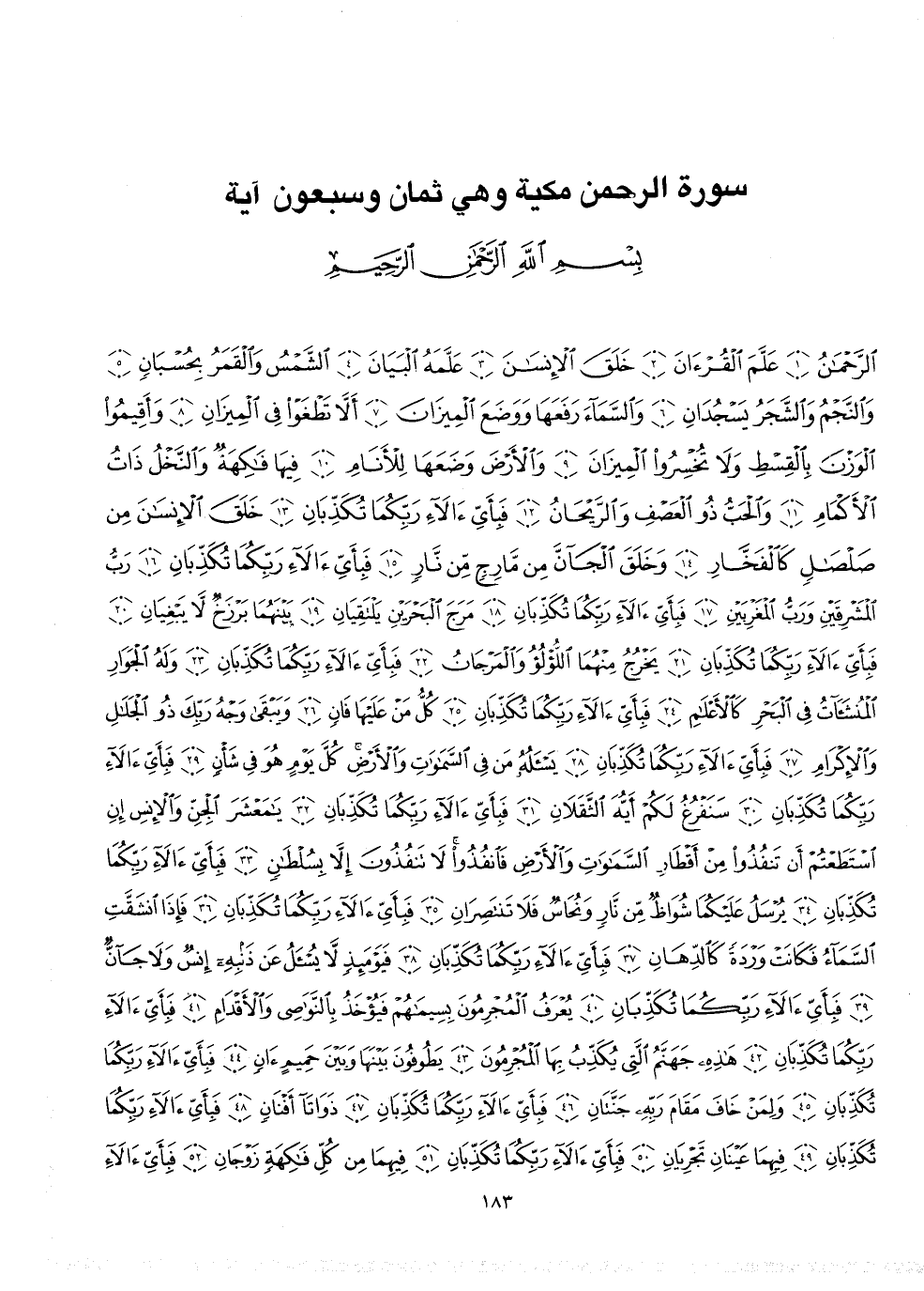 2 ( ) الرَّحْمَنُ عَلَّمَ الْقُرْءَانَ خَلَقَ الإِنسَانَ عَلَّمَهُ البَيَانَ الشَّمْسُ وَالْقَمَرُ بِحُسْبَانٍ وَالنَّجْمُ وَالشَّجَرُ يَسْجُدَانِ وَالسَّمَآءَ رَفَعَهَا وَوَضَعَ الْمِيزَانَ أَلاَّ تَطْغَوْاْ فِى الْمِيزَانِ وَأَقِيمُواْ الْوَزْنَ بِالْقِسْطِ وَلاَ تُخْسِرُواْ الْمِيزَانَ وَالاٌّ رْضَ وَضَعَهَا لِلاٌّ نَامِ فِيهَا فَاكِهَةٌ وَالنَّخْلُ ذَاتُ الاٌّ كْمَامِ وَالْحَبُّ ذُو الْعَصْفِ وَالرَّيْحَانُ فَبِأَىِّ ءَالاءِ رَبِّكُمَا تُكَذِّبَانِ خَلَقَ الإِنسَانَ مِن صَلْصَالٍ كَالْفَخَّارِ وَخَلَقَ الْجَآنَّ مِن مَّارِجٍ مِّن نَّارٍ فَبِأَىِّ ءَالاءِ رَبِّكُمَا تُكَذِّبَانِ رَبُّ الْمَشْرِقَيْنِ وَرَبُّ الْمَغْرِبَيْنِ فَبِأَىِّ ءَالاءِ رَبِّكُمَا تُكَذِّبَانِ مَرَجَ الْبَحْرَيْنِ يَلْتَقِيَانِ بَيْنَهُمَا بَرْزَخٌ لاَّ يَبْغِيَانِ فَبِأَىِّ ءَالاءِ رَبِّكُمَا تِكَذِّبَانِ يَخْرُجُ مِنْهُمَا الُّلؤْلُؤُ وَالمَرْجَانُ فَبِأَىِّ ءَالاَءِ رَبِّكُمَا تُكَذِّبَانِ وَلَهُ الْجَوَارِ الْمُنشَئَاتُ فِى الْبَحْرِ كَالاٌّ عْلَامِ فَبِأَىِّ ءَالاءِ رَبِّكُمَا تُكَذِّبَانِ كُلُّ مَنْ عَلَيْهَا فَانٍ وَيَبْقَى وَجْهُ رَبِّكَ ذُو الْجَلْالِ وَالإِكْرَامِ فَبِأَىِّ ءَالاءِ رَبِّكُمَا تُكَذِّبَانِ يَسْأَلُهُ مَن فِى السَّمَاوَاتِ وَالاٌّ رْضِ كُلَّ يَوْمٍ هُوَ فِى شَأْنٍ فَبِأَىِّ ءَالاءِ رَبِّكُمَا تُكَذِّبَانِ سَنَفْرُغُ لَكُمْ أَيُّهَا الثَّقَلاَنِ فَبِأَىِّ ءَالاءِ رَبِّكُمَا تُكَذِّبَانِ يامَعْشَرَ الْجِنِّ وَالإِنسِ إِنِ اسْتَطَعْتُمْ أَن تَنفُذُواْ مِنْ أَقْطَارِ السَّمَاوَاتِ وَالاٌّ رْضِ فَانفُذُواْ لاَ تَنفُذُونَ إِلاَّ بِسُلْطَانٍ فَبِأَىِّ ءَالاءِ رَبِّكُمَا تُكَذِّبَانِ يُرْسَلُ عَلَيْكُمَا شُوَاظٌ مِّن نَّارٍ وَنُحَاسٌ فَلاَ تَنتَصِرَانِ فَبِأَىِّ ءَالاءِ رَبِّكُمَا تُكَذِّبَانِ فَإِذَا انشَقَّتِ السَّمَآءُ فَكَانَتْ وَرْدَةً كَالدِّهَانِ فَبِأَىِّ ءَالاءِ رَبِّكُمَا تُكَذِّبَانِ فَيَوْمَئِذٍ لاَّ يُسْألُ عَن ذَنبِهِ إِنسٌ وَلاَ جَآنٌّ فَبِأَىِّ ءَالاءِ رَبِّكُمَا تُكَذِّبَانِ يُعْرَفُ الْمُجْرِمُونَ بِسِيمَاهُمْ فَيُؤْخَذُ بِالنَّوَاصِى وَالاٌّ قْدَامِ فَبِأَىِّ ءَالاءِ رَبِّكُمَا تُكَذِّبَانِ هَاذِهِ جَهَنَّمُ الَّتِى يُكَذِّبُ بِهَا الْمُجْرِمُونَ يَطُوفُونَ بَيْنَهَا وَبَيْنَ حَمِيمٍ ءَانٍ فَبِأَىِّ ءَالاءِ رَبِّكُمَا تُكَذِّبَانِ وَلِمَنْ خَافَ مَقَامَ رَبِّهِ جَنَّتَانِ فَبِأَىِّ ءَالاءِ رَبِّكُمَا تُكَذِّبَانِ ذَوَاتَآ أَفْنَانٍ فَبِأَىِّ ءَالاءِ رَبِّكُمَا تُكَذِّبَانِ فِيهِمَا عَيْنَانِ تَجْرِيَانِ فَبِأَىِّ ءَالاءِ رَبِّكُمَا تُكَذِّبَانِ فِيهِمَا مِن كُلِّ فَاكِهَةٍ زَوْجَانِ فَبِأَىِّ ءَالا
