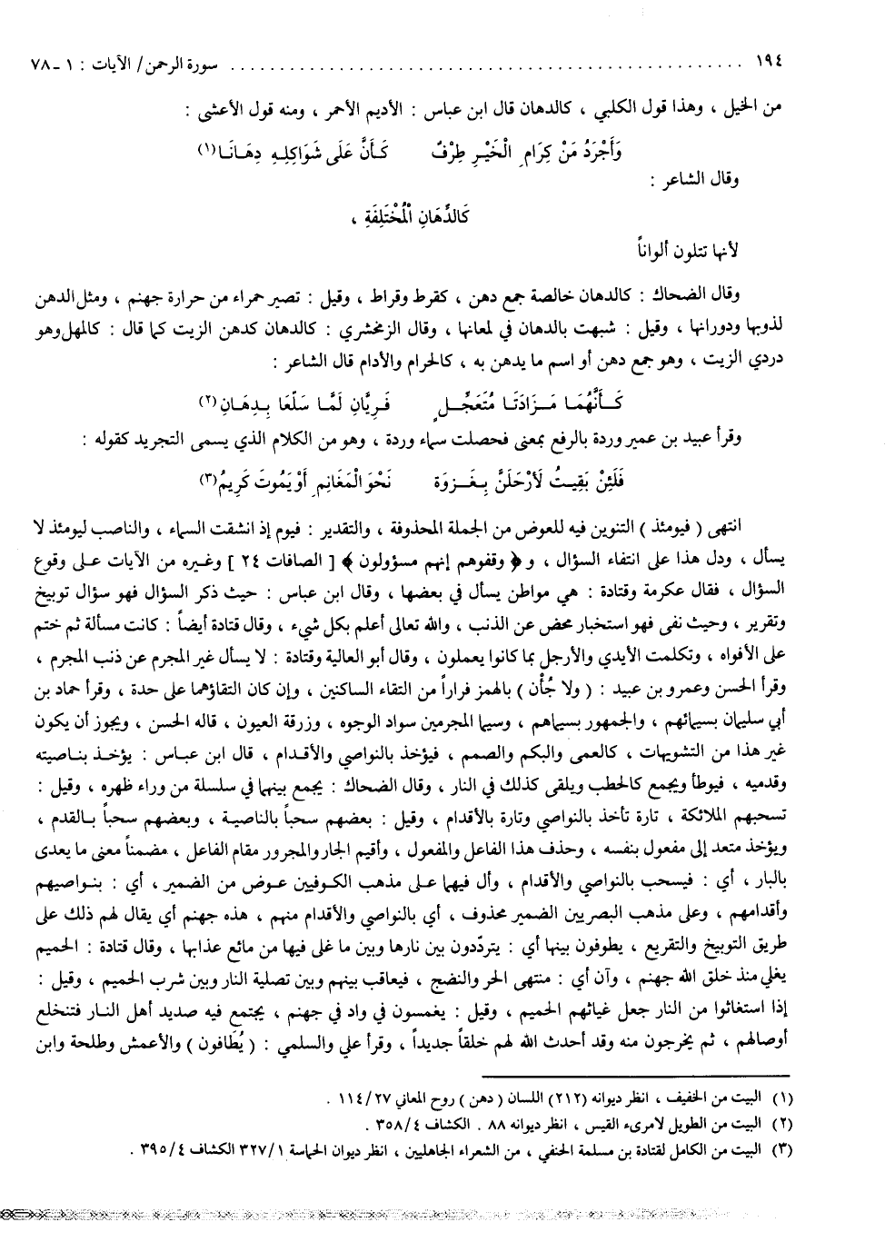 وقال الشاعر : كالدهان المختلفة ، لأنها تتلون ألواناً . وقال الضحاك : كالدهان خالصة ، جمع دهن ، كقرط وقراط . وقيل : تصير حمراء من حرارة جهنم ، ومثل الدهن لذوبها ودورانها . وقيل : شبهت بالدهان في لمعانها . وقال الزمخشري : ) كَالدّهَانِ ( : كدهن الزيت ، كما قال : ) كَالْمُهْلِ ( ، وهو دردي الزيت ، وهو جمع دهن ، أو اسم ما يدهن به ، كالحرام والأدام ، قال الشاعر : كأنهما مزادتا متعجل