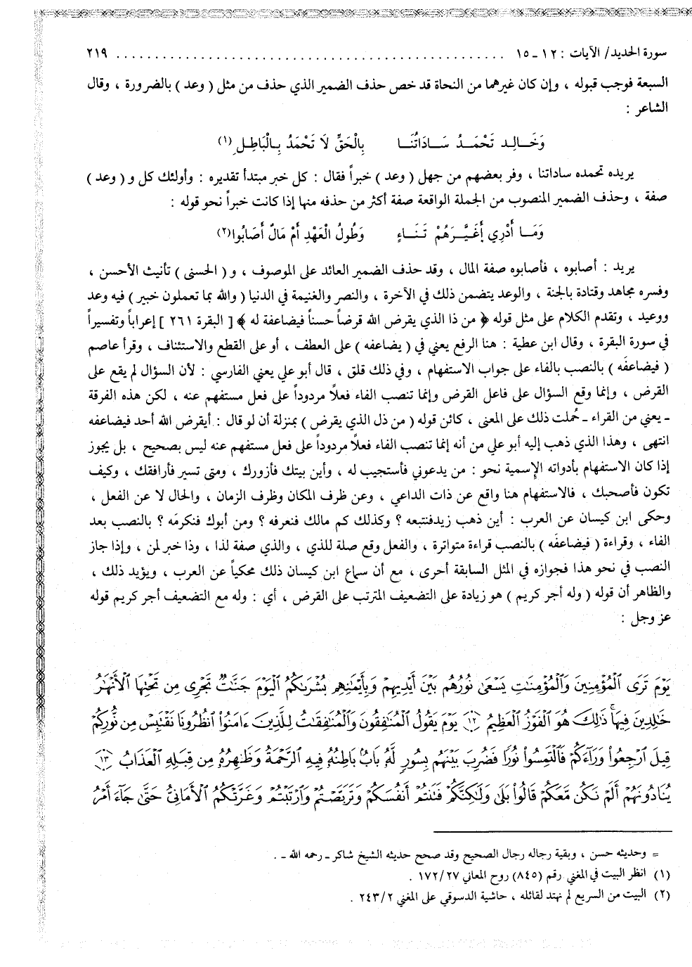 قوله عز وجل : ) يَوْمَ تَرَى الْمُؤْمِنِينَ وَالْمُؤْمِنَاتِ يَسْعَى نُورُهُم بَيْنَ أَيْدِيهِمْ وَبِأَيْمَانِهِم بُشْرَاكُمُ الْيَوْمَ جَنَّاتٌ تَجْرِى مِن تَحْتِهَا الاْنْهَارُ خَالِدِينَ فِيهَا ذَلِك ( سقط : سقط إلى آخر الصفحة ) َ ).