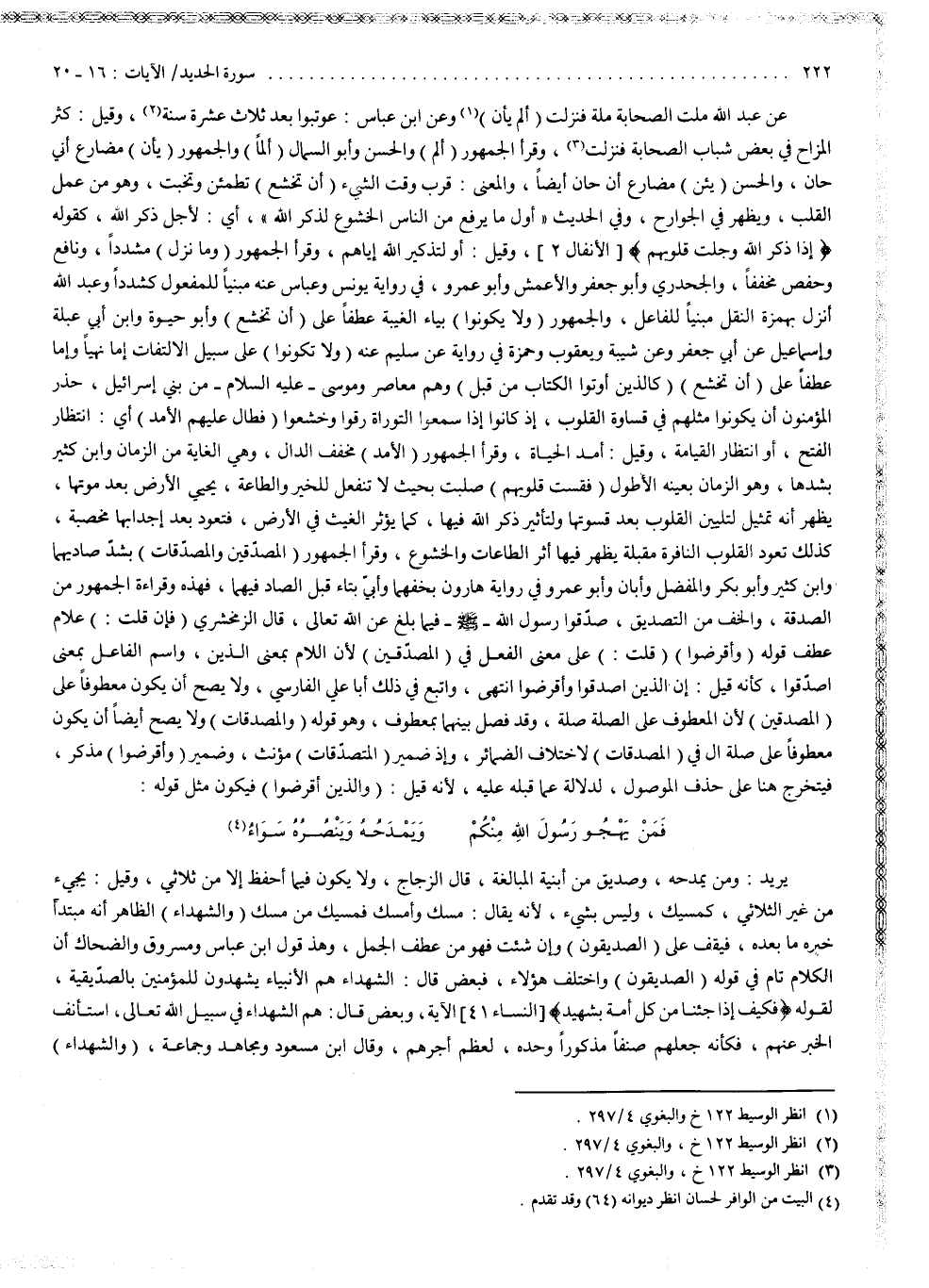 عن عبد الله : ملت الصحابة ملة ، فنزلت ) أَلَمْ يَأْنِ ). وعن ابن عباس : عوتبوا بعد ثلاث عشرة سنة . وقيل : كثر المزاح في بعض شباب الصحابة فنزلت . وقرأ الجمهور : ) الم ( ؛ والحسن وأبو السمال : ألما . والجمهور : ) يَأْنِ ( مضارع أنى حان ؛ والحسن : يئن مضارع أن حان أيضاً ، والمعنى : قرب وقت الشيء . ) أَن تَخْشَعَ ( : تطمئن وتخبت ، وهو من عمل القلب ، ويظهر في الجوارح . وفي الحديث : ( أول ما يرفع من الناس الخشوع ) . ) لِذِكْرِ اللَّهِ ( : أي لأجل ذكر الله ، كقوله : ) إِذَا ذُكِرَ اللَّهُ وَجِلَتْ قُلُوبُهُمْ ). قيل : أو لتذكير الله إياهم . وقرأ الجمهور : وما نزل مشدداً ؛ ونافع وحفص : مخففاً ؛ والحجدري وأبو جعفر والأعمش وأبو عمرو في رواية يونس ، وعباس عنه : مبنياً للمفعول مشدداً ؛ وعبد الله : أنزل بهمزة النقل مبنياً للفاعل . والجمهور : ) وَلاَ يَكُونُواْ ( بياء الغيبة ، عطفاً على ) أَن تَخْشَعَ ( ؛ وأبو حيوة وابن أبي عبلة وإسماعيل عن أبي جعفر ، وعن شيبة ، ويعقوب وحمزة في رواية عن سليم عنه : ولا تكونوا على سبيل الالتفات ، إما نهياً ، وإما عطفاً على ) أَن تَخْشَعَ ). ) كَالَّذِينَ أُوتُواْ الْكِتَابَ مِن قَبْلُ ( ، وهم معاصرو موسى عليه السلام من بني إسرائيل . حذر المؤمنون أن يكونوا مثلهم في قساوة القلوب ، إذ كانوا إذا سمعوا التوراة رقوا وخشعوا ، ( فَطَالَ عَلَيْهِمُ الاْمَدُ ( : أي انتظار الفتح ، أو انتظار القيامة . وقيل : أمد الحياة . وقرأ الجمهور : الأمد مخفف الدال ، وهي الغاية من الزمان ؛ وابن كثير : بشدها ، وهو الزمان بعينه الأطول . ) فَقَسَتْ قُلُوبُهُمْ ( : صلبت بحيث لا تنفعل للخير والطاعة .