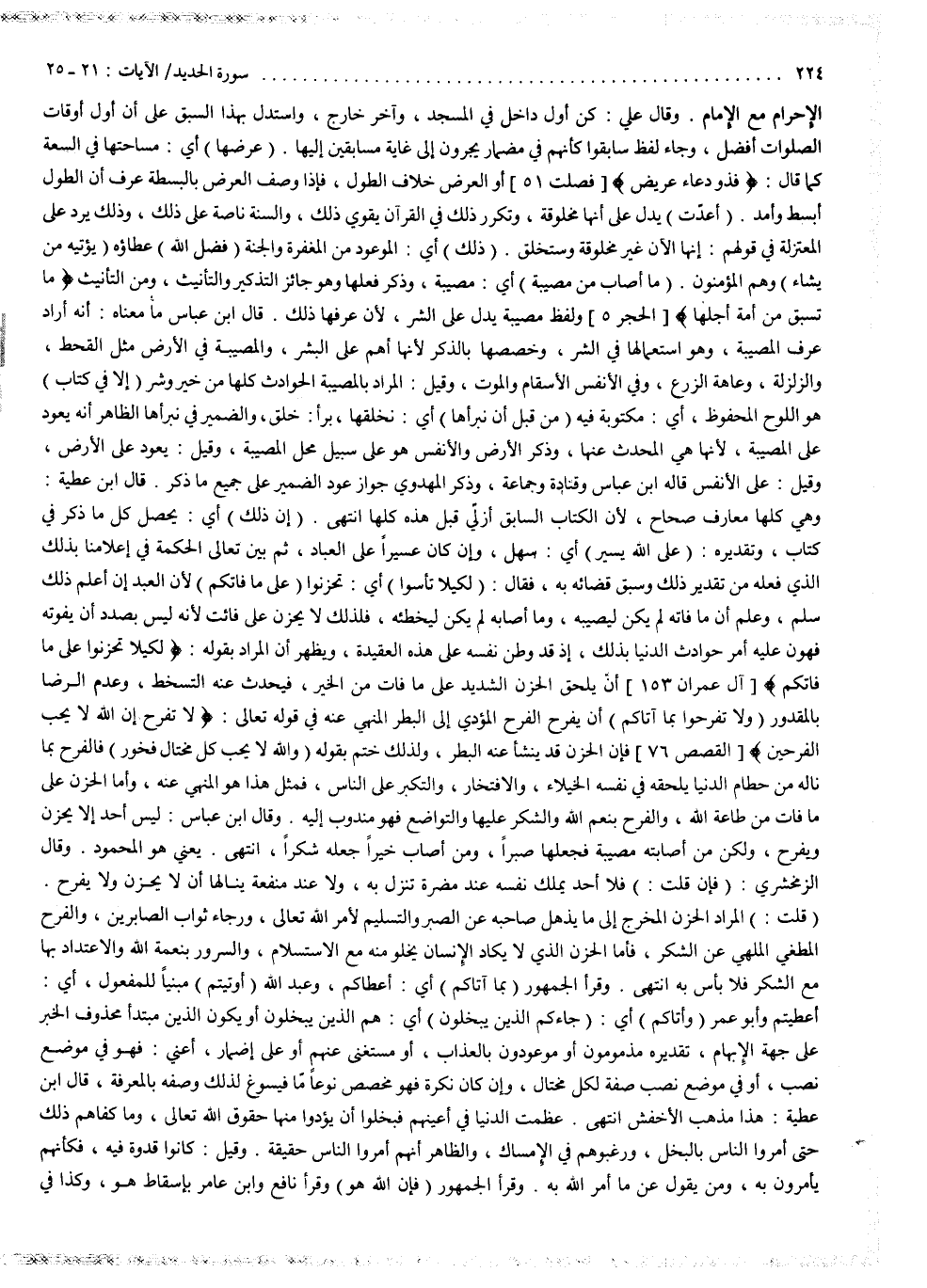 ثم بين تعالى الحكمة في إعلامنا بذلك الذي فعله من تقدير ذلك ، وسبق قضائه به فقال : ) لّكَيْلاَ تَأْسَوْاْ ( : أي تحزنوا ، ( عَلَى مَا فَاتَكُمْ ( ، لأن العبد إن أعلم ذلك سلم ، وعلم أن ما فاته لم يكن ليصيبه ، وما أصابه لم يكن ليخطئه ، فلذلك لا يحزن على فائت ، لأنه ليس بصدد أن يفوته ، فهون عليه أمر حوادث الدنيا بذلك ، إذ قد وطن نفسه على هذه العقيدة . ويظهر أن المراد بقوله : ) لّكَيْلاَ تَحْزَنُواْ عَلَى مَا فَاتَكُمْ ( : أن يلحق الحزن الشديد على ما فات من الخير ، فيحدث عنه التسخط وعدم الرضا بالمقدور . ) وَلاَ تَفْرَحُواْ بِمَا ءاتَاكُمْ ( : أن يفرح الفرح المؤدي إلى البطر المنهي عنه في قوله تعالى : ) لاَ تَفْرَحْ إِنَّ اللَّهَ لاَ يُحِبُّ الْفَرِحِينَ ( ، فإن الحزن قد ينشأ عنه البطر ، ولذلك ختم بقوله : ) وَاللَّهُ لاَ يُحِبُّ كُلَّ مُخْتَالٍ فَخُورٍ ). فالفرح بما ناله من حطام الدنيا يلحقه في نفسه الخيلاء والافتخار والتكبر على الناس ، فمثل هذا هو المنهي عنه . وأما الحزن على ما فات من طاعة الله ، والفرح بنعم الله والشكر عليها والتواضع ، فهو مندوب إليه .
