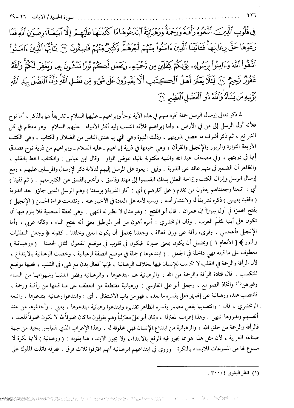 ( ثُمَّ قَفَّيْنَا ( : أي اتبعنا وجعلناهم يقفون من تقدم ، ( عَلَىءاثَارِهِمْ ( : أي آثار الذرية ، ( بِرُسُلِنَا ( : وهم الرسل الذين جاءوا بعد الذرية ، ( وَقَفَّيْنَا بِعِيسَى ( : ذكره تشريفاً له ، ولانتشار أمته ، ونسبه لأمه على العادة في الإخبار عنه . وتقدمت قراءة الحسن : الإنجيل ، بفتح الهمزة في أول سورة آل عمران . قال أبو الفتح : وهو مثال لا نظير له . انتهى ، وهي لفظة أعجمية ، فلا يلزم فيها أن تكون على أبنية كلم العرب . وقال الزمخشري : أمره أهون من أمر البرطيل ، يعني أنه بفتح الباء وكأنه عربي ؛ وأما الإنجيل فأعجمي . وقرىء : رآفة على وزن فعالة ، ( وَجَعَلْنَا ( : يحتمل أن يكون المعنى وخلقنا ، كقوله : ) وَجَعَلَ الظُّلُمَاتِ وَالنُّورَ ( ، ويحتمل أن يكون بمعنى صيرنا ، فيكون ) فِى قُلُوبِ ( : في موضع المفعول الثاني لجعلنا . ) وَرَهْبَانِيَّةً ( معطوف على ما قبله ، فهي داخلة في الجمل . ) ابتَدَعُوهَا ( : جملة في موضع الصفة لرهبانية ، وخصت الرهبانية بالابتداع ، لأن الرأفة والرحمة في القلب لا تكسب للإنسان فيها ، بخلاف الرهبانية ، فإنها أفعال بدن مع شيء في القلب ، ففيها موضع للتكسب . قال قتادة : الرأفة والرحمة من الله ، والرهبانية هم ابتدعوها ؛ والرهبانية : رفض الدنيا وشهواتها من النساء وغيرهنّ واتخاد الصوامع . وجعل أبو علي الفارسي ) وَرَهْبَانِيَّةً ( مقتطعة من العطف على ما قبلها من ) رَأْفَةً وَرَحْمَةً ( ، فانتصب عنده ) وَرَهْبَانِيَّةً ( على إضمار فعل يفسره ما بعده ، فهو من باب الاشتغال ، أي وابتدعوا رهبانية ابتدعوها . واتبعه الزمخشري فقال : وانتصابها بفعل مضمر يفسره الظاهر تقديره : وابتدعوا رهبانية ابتدعوها ، يعني وأحدثوها من عند أنفسهم ونذروها . انتهى ، وهذا إعراب المعتزلة ، وكان أبو عليّ معتزلياً . وهم يقولون : ما كان مخلوقاً لله لا يكون مخلوقاً للعبد ، فالرأفة والرحمة من خلق الله ، والرهبانية من ابتداع الإنسان ، فهي مخلوقة له . وهذا الإعراب الذي لهم ليس بجيد من جهة صناعة العربية ، لأن مثل هذا هو مما يجوز فيه الرفع بالابتداء ، ولا يجوز الابتداء هنا بقوله : ) وَرَهْبَانِيَّةً ( ، لأنها نكرة لا مسوغ لها من المسوغات للابتداء بالنكرة .