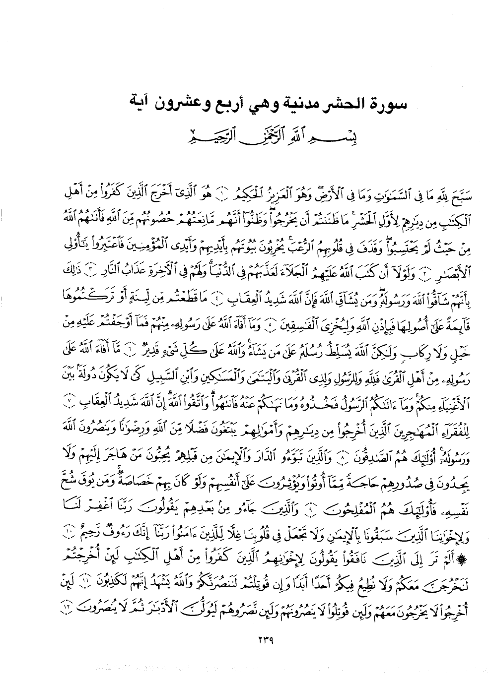 2 ( ) سَبَّحَ لِلَّهِ مَا فِى السَّمَاوَاتِ وَمَا فِى الاٌّ رْضِ وَهُوَ الْعَزِيزُ الْحَكِيمُ هُوَ الَّذِىأَخْرَجَ الَّذِينَ كَفَرُواْ مِنْ أَهْلِ الْكِتَابِ مِن دِيَارِهِمْ لاًّوَّلِ الْحَشْرِ مَا ظَنَنتُمْ أَن يَخْرُجُواْ وَظَنُّواْ أَنَّهُمْ مَّانِعَتُهُمْ حُصُونُهُم مِّنَ اللَّهِ فَأَتَاهُمُ اللَّهُ مِنْ حَيْثُ لَمْ يَحْتَسِبُواْ وَقَذَفَ فِى قُلُوبِهِمُ الرُّعْبَ يُخْرِبُونَ بُيُوتَهُمْ بِأَيْدِيهِمْ وَأَيْدِى الْمُؤْمِنِينَ فَاعْتَبِرُواْ ياأُوْلِى الاٌّ بْصَارِ وَلَوْلاَ أَن كَتَبَ اللَّهُ عَلَيْهِمُ الْجَلاَءَ لَعَذَّبَهُمْ فِى الدُّنْيَا وَلَهُمْ فِى الاٌّ خِرَةِ عَذَابُ النَّارِ ذَلِكَ بِأَنَّهُمْ شَآقُّواْ اللَّهَ وَرَسُولَهُ وَمَن يُشَآقِّ اللَّهَ فَإِنَّ اللَّهَ شَدِيدُ الْعِقَابِ مَا قَطَعْتُمْ مِّن لِّينَةٍ أَوْ تَرَكْتُمُوهَا قَآئِمَةً عَلَى أُصُولِهَا فَبِإِذْنِ اللَّهِ وَلِيُخْزِىَ الْفَاسِقِينَ وَمَآ أَفَآءَ اللَّهُ عَلَى رَسُولِهِ مِنْهُمْ فَمَآ أَوْجَفْتُمْ عَلَيْهِ مِنْ خَيْلٍ وَلاَ رِكَابٍ وَلَاكِنَّ اللَّهَ يُسَلِّطُ رُسُلَهُ عَلَى مَن يَشَآءُ وَاللَّهُ عَلَى كُلِّ شَىْءٍ قَدِيرٌ مَّآ أَفَآءَ اللَّهُ عَلَى رَسُولِهِ مِنْ أَهْلِ الْقُرَى فَلِلَّهِ وَلِلرَّسُولِ وَلِذِى الْقُرْبَى وَالْيَتَامَى وَالْمَسَاكِينِ وَابْنِ السَّبِيلِ كَى لاَ يَكُونَ دُولَةً بَيْنَ الاٌّ غْنِيَآءِ مِنكُمْ وَمَآ ءَاتَاكُمُ الرَّسُولُ فَخُذُوهُ وَمَا نَهَاكُمْ عَنْهُ فَانتَهُواْ وَاتَّقُواْ اللَّهَ إِنَّ اللَّهَ شَدِيدُ الْعِقَابِ لِلْفُقَرَآءِ الْمُهَاجِرِينَ الَّذِينَ أُخْرِجُواْ مِن دِيَارِهِمْ وَأَمْوَالِهِمْ يَبْتَغُونَ فَضْلاً مِّنَ اللَّهِ وَرِضْوَاناً وَيَنصُرُونَ اللَّهَ وَرَسُولَهُ أُوْلَائِكَ هُمُ الصَّادِقُونَ وَالَّذِينَ تَبَوَّءُوا الدَّارَ وَالإِيمَانَ مِن قَبْلِهِمْ يُحِبُّونَ مَنْ هَاجَرَ إِلَيْهِمْ وَلاَ يَجِدُونَ فِى صُدُورِهِمْ حَاجَةً مِّمَّآ أُوتُواْ وَيُؤْثِرُونَ عَلَى أَنفُسِهِمْ وَلَوْ كَانَ بِهِمْ خَصَاصَةٌ وَمَن يُوقَ شُحَّ نَفْسِهِ فَأُوْلَائِكَ هُمُ الْمُفْلِحُونَ وَالَّذِينَ جَآءُوا مِن بَعْدِهِمْ يَقُولُونَ رَبَّنَا اغْفِرْ لَنَا وَلإِخْوَانِنَا الَّذِينَ سَبَقُونَا بِالإَيمَانِ وَلاَ تَجْعَلْ فِى قُلُوبِنَا غِلاًّ لِّلَّذِينَ ءَامَنُواْ رَبَّنَآ إِنَّكَ رَءُوفٌ رَّحِيمٌ أَلَمْ تَرَ إِلَى الَّذِينَ نَافَقُواْ يَقُولُونَ لإِخْوَانِهِمُ الَّذِينَ كَفَرُواْ مِنْ أَهْلِ الْكِتَابِ لَئِنْ أُخْرِجْتُمْ لَنَخْرُجَنَّ مَعَكُمْ وَلاَ نُطِيعُ فيكُمْ أَحَداً أَبَداً وَإِن قُوتِلْتُمْ لَنَنصُرَنَّكُمْ وَاللَّهُ يَشْهَدُ إِنَّهُمْ لَكَاذِبُونَ لَئِنْ أُخْرِجُواْ لاَ يَخْرُجُونَ مَعَهُمْ وَلَئِن قُوتِلُواْ لاَ يَنصُرُونَهُمْ وَلَئِن نَّصَرُوهُمْ لَيُوَلُّنَّ الاٌّ دْبَارَ ثُمَّ لاَ يُنصَرُونَ